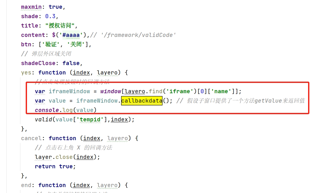var value = iframeWindow.callbackdata(); // 假设子窗口提供了一个方法getValue来返回值