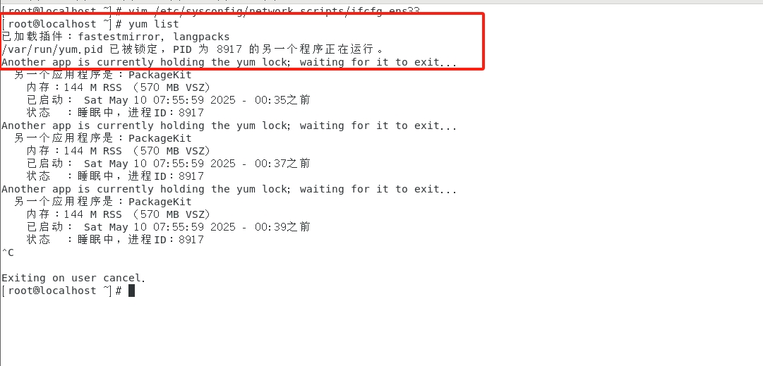 rm -f /var/run/yum.pid #直接用rm命令删除即可 查看yum进程 ps -aux | grep yum
