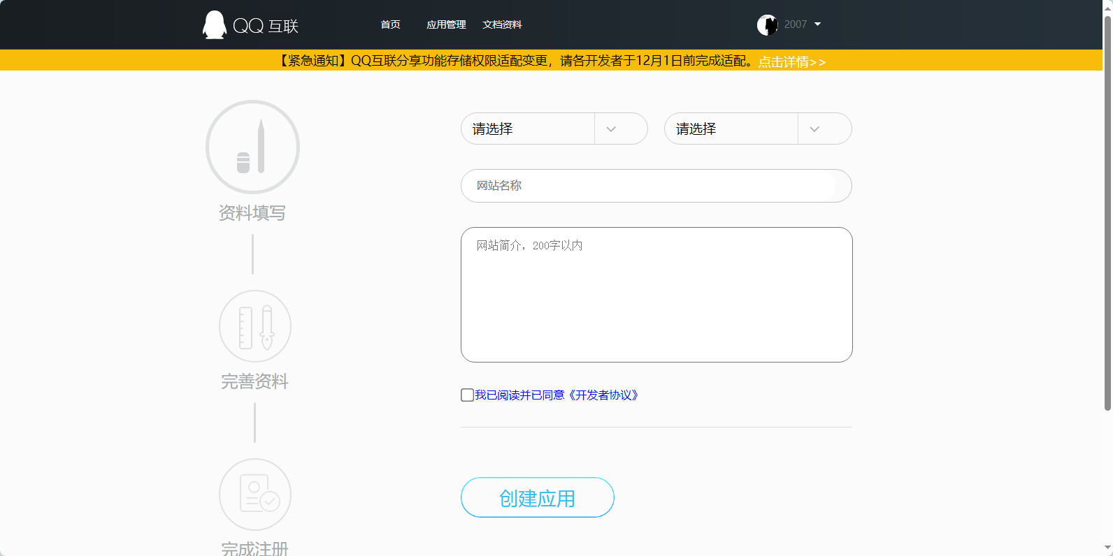 | 3 | 创建应用 | https://connect.qq.com/manage.html#/ |
