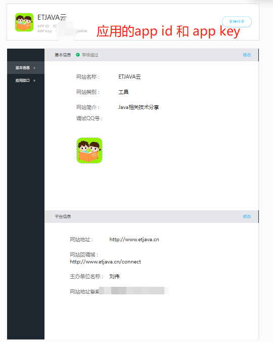 4.1 只要创建了应用 其app id和app key就都能拿到了,将demo中对应的改为自己的信息 就可以发布到外网进行审核了