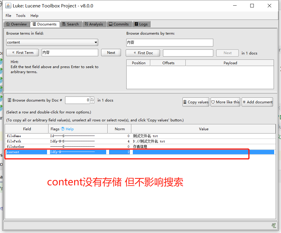 document.add(new TextField("content","文件内容。。。。。。。。", Field.Store.NO));