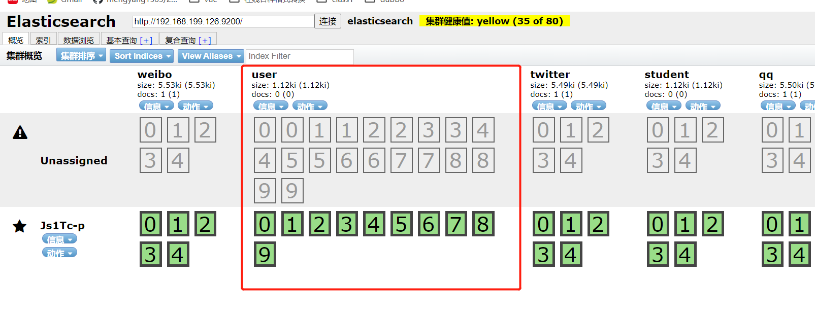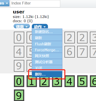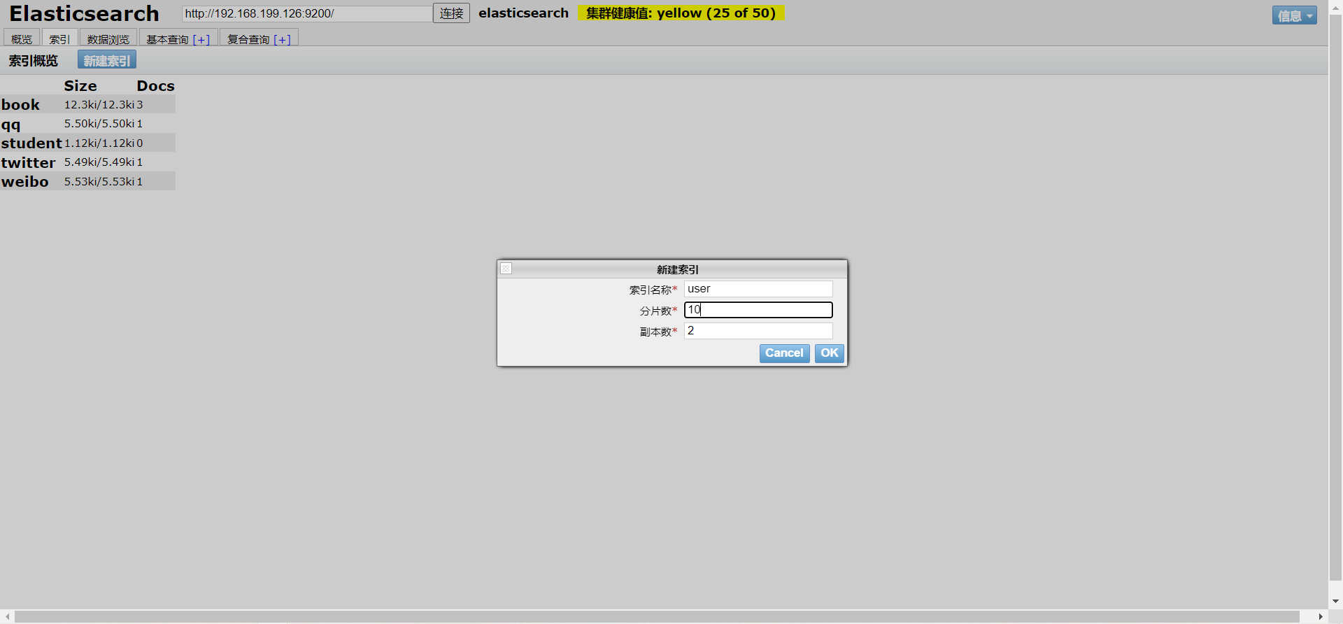 这里我们输入索引名称即可 当然默认分片数是5 副本数是1 我们输入索引名称user 分片数10 副本2
