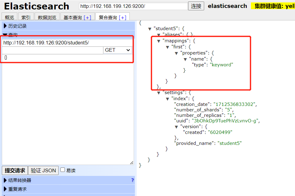 http://192.168.199.126:9200/student5/ GET 直接加索引名称即可 能查到所有信息