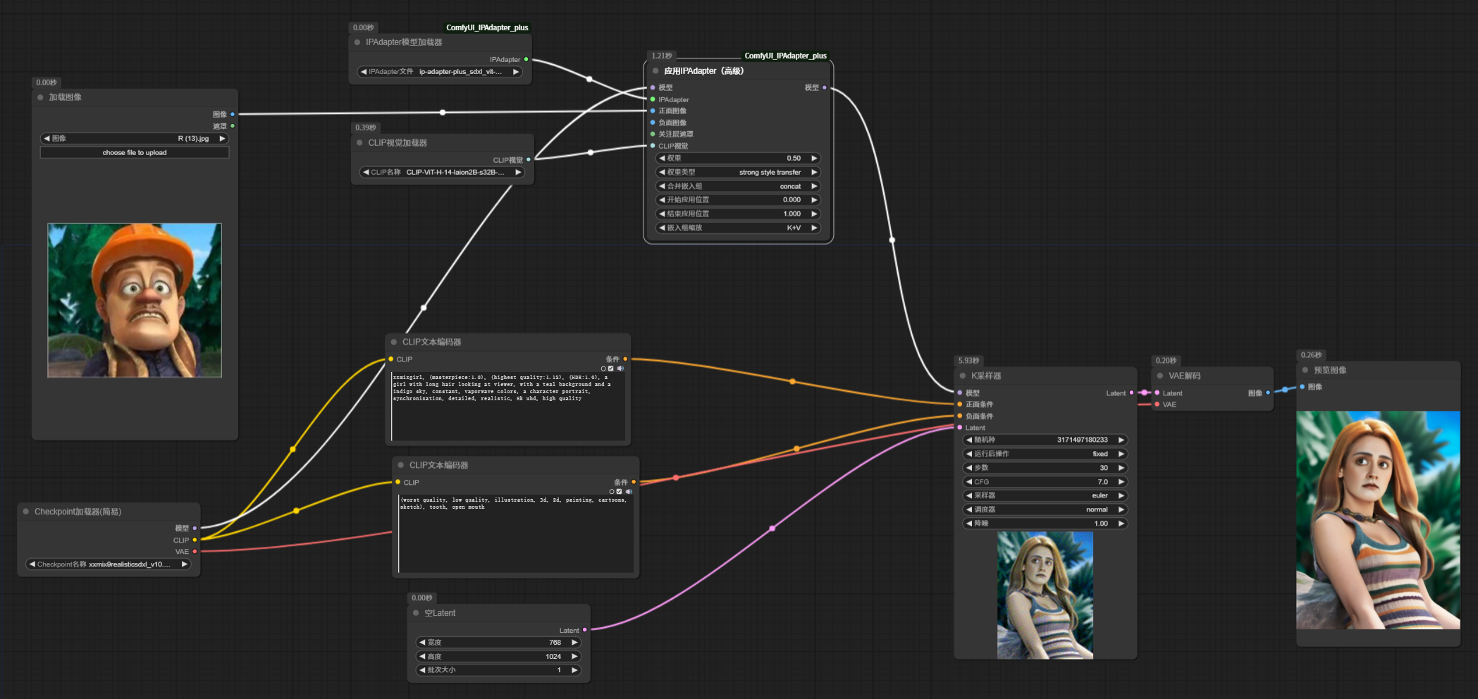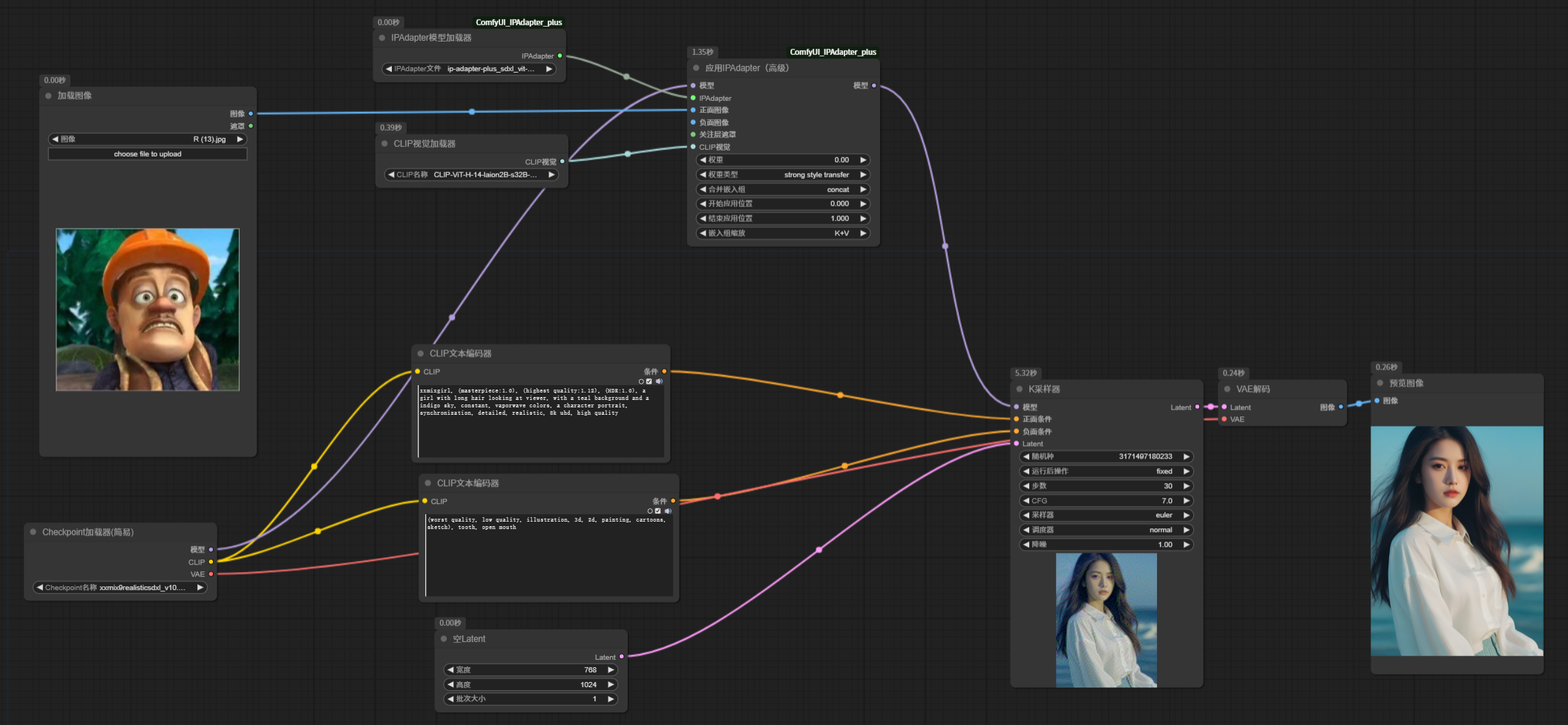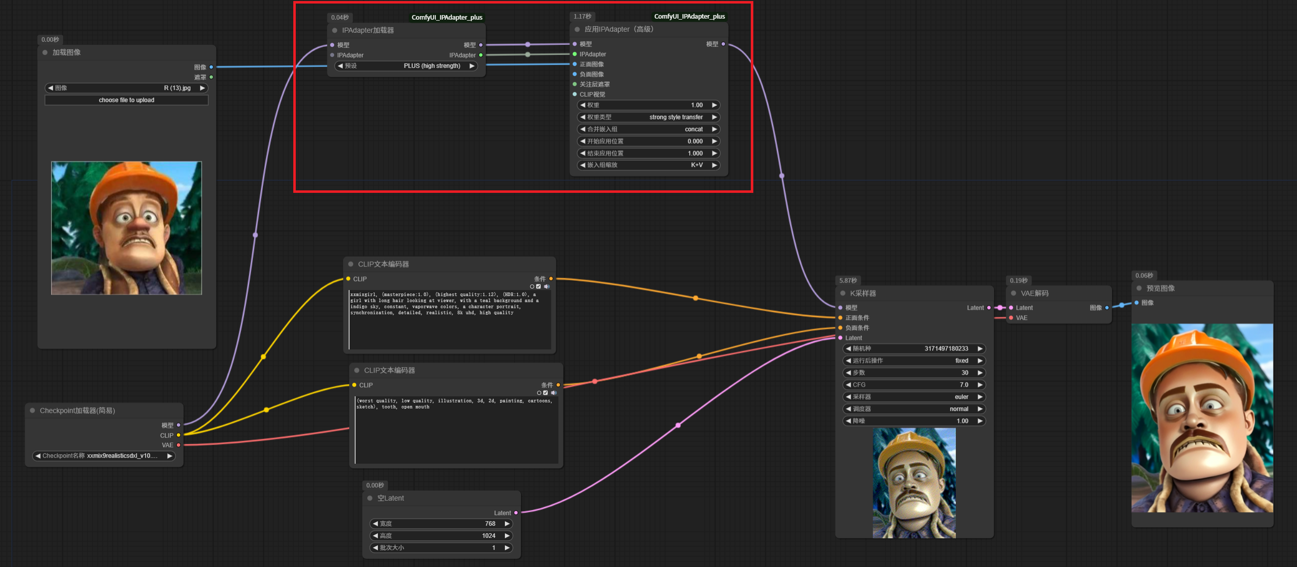该节点需要将基础大模型连接到输入,输出的模型连接到应用 IPAdapter 节点。测试生成的图像和之前效果是一样的。