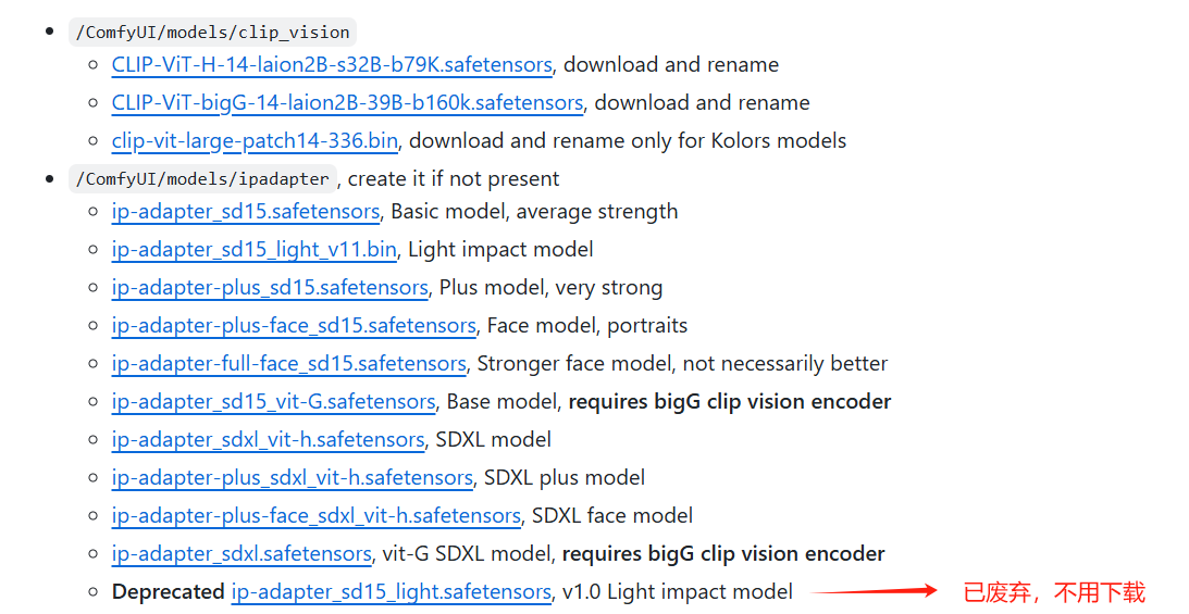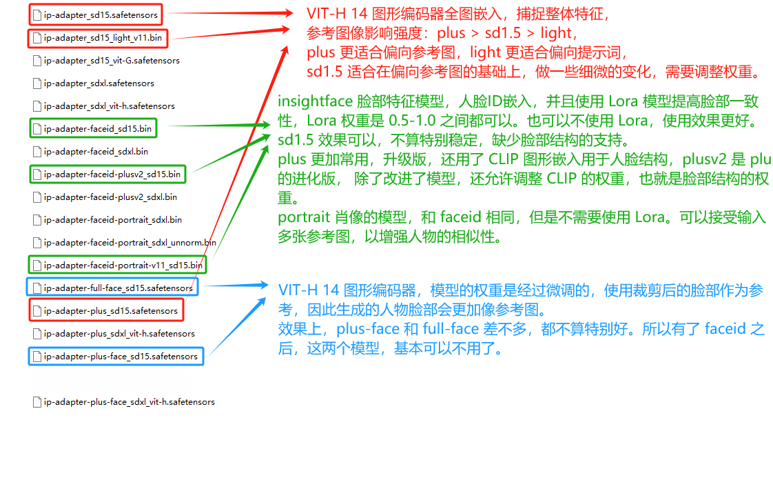 图中对 sd 1.5 模型进行了说明。除了框起来的部分,剩下的模型,根据名字,可以看到一些是 SDXL 版本的,还有一些则需要使用 bigG clip vision 模型进行视觉编码。