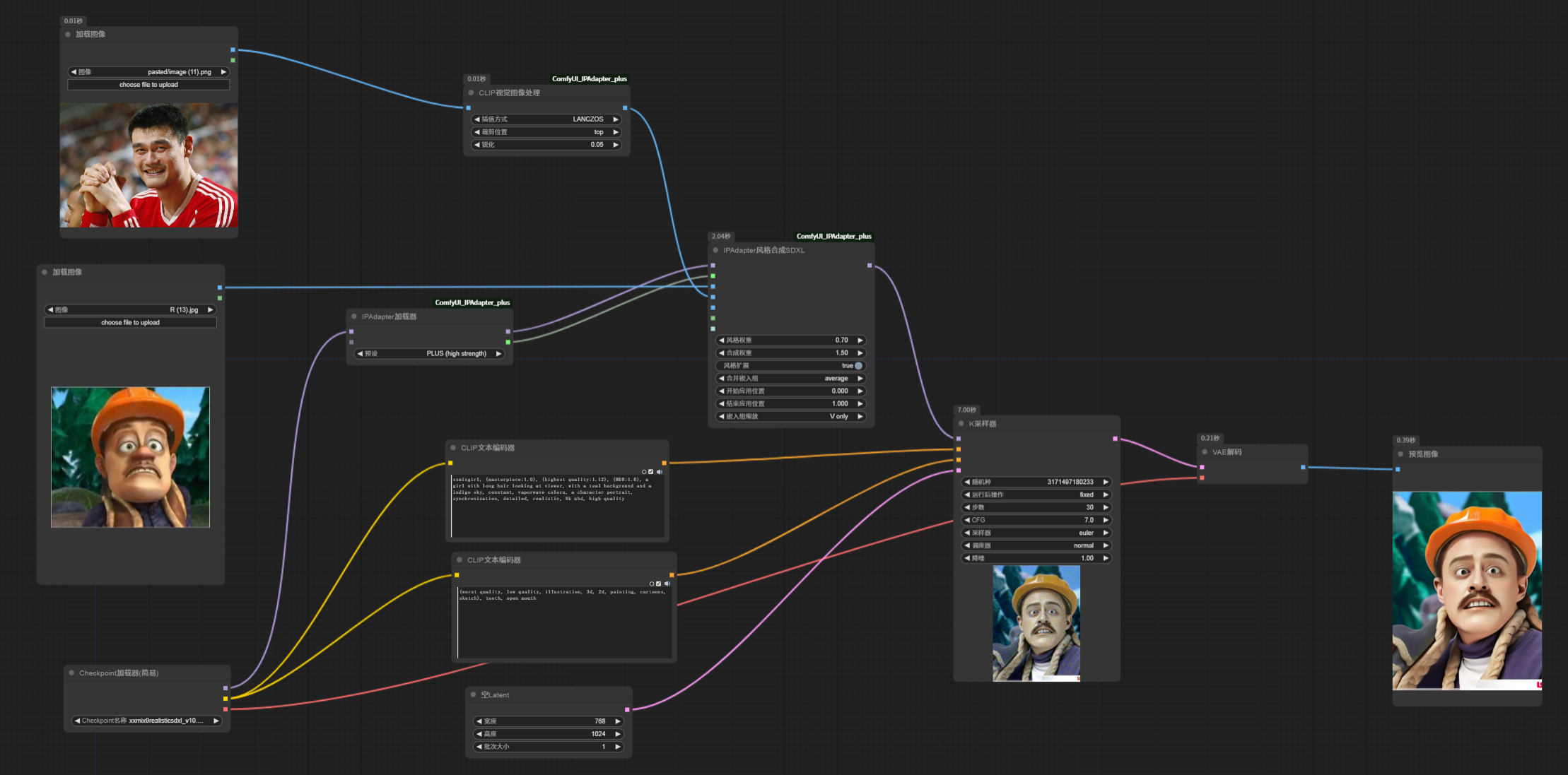 这里参考光头强图片的构图,参考姚明的肖像,生成的图片,可以看到,背景是森林的,人物肖像是姚明。融合了两者的风格。