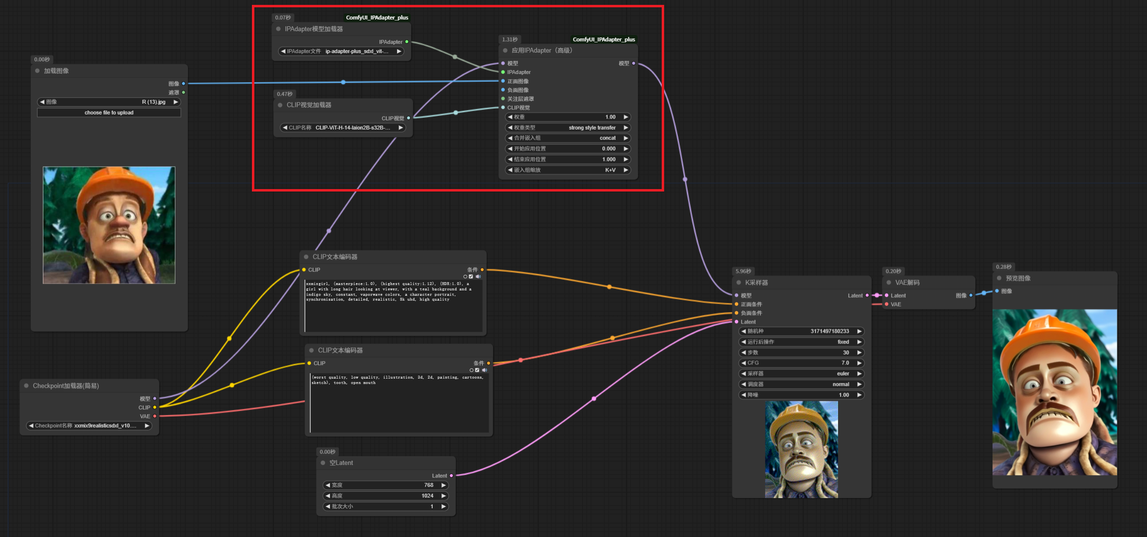 这里,我们输入了一张光头强的图片,核心节点主要是 应用 IPAdapter 节点,模型需要通过一个IPAdapter 模型加载器 加载一个 IP-Adapter 的模型输入。注意,这里的模型要和基础大模型版本匹配。同时还需要使用 CLIP 视觉加载器 加载一个视觉模型,这些模型都是刚才下载下来的。