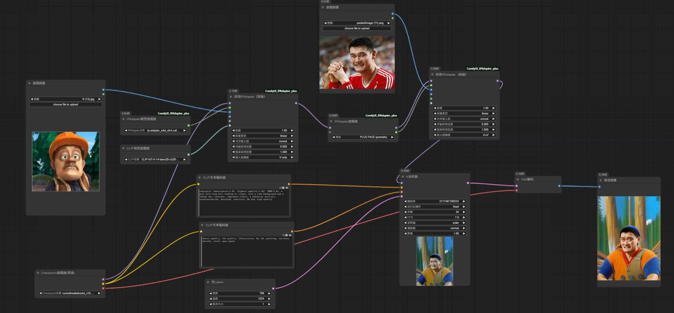 我们固定了采样器的随机种子,其余参数也不变,IP-Adapater 模型权重设置为 1, 看看生成效果,此时生成的人物,已经变成了光头强风格,并且后面的背景也变成了森林。