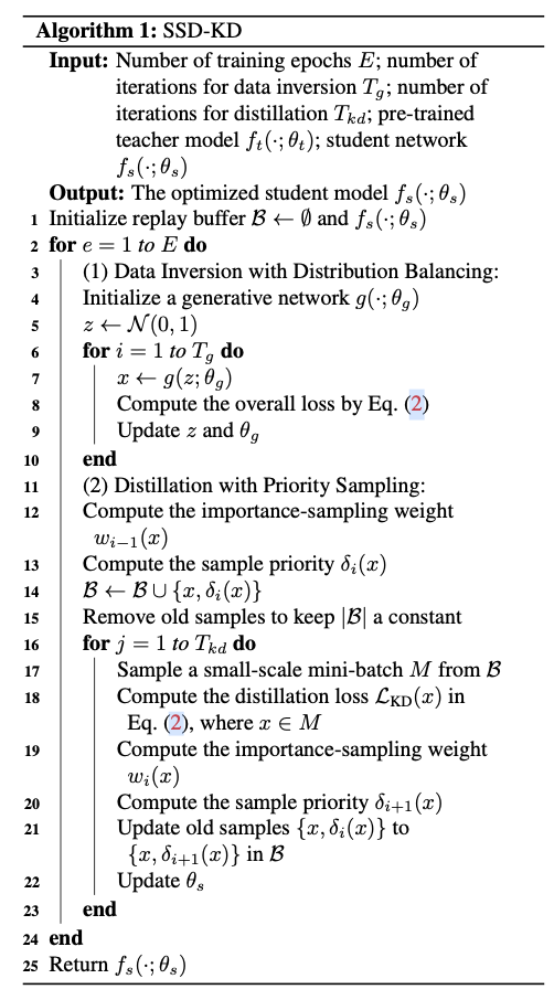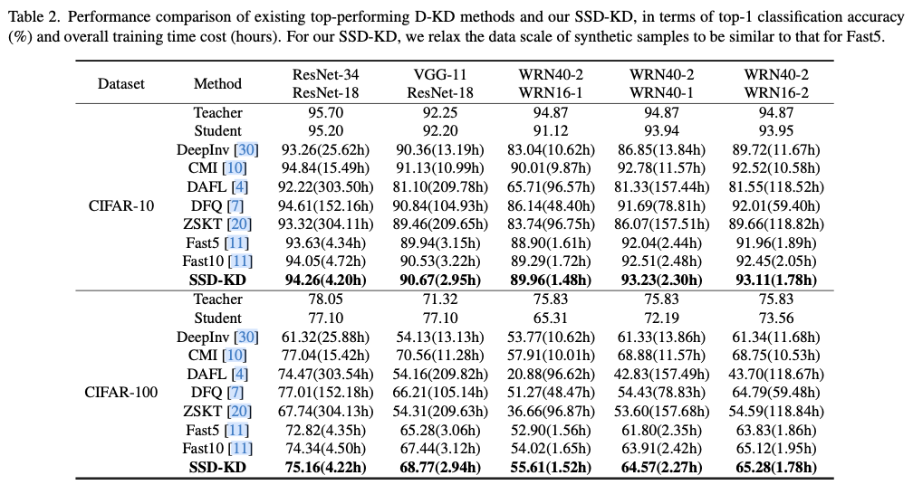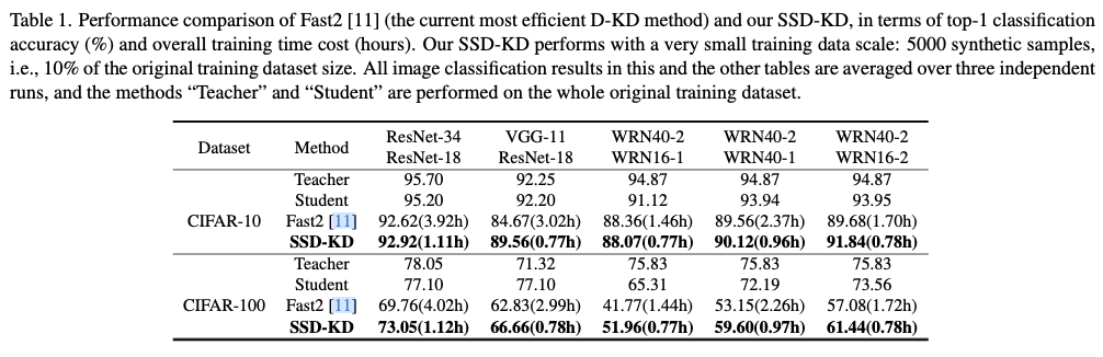虽然D-KD流水线允许合成训练样本并用于在同一任务上训练学生模型,但存在大量数据冗余,这妨碍了D-KD方法的训练效率。SSD-KD是一种完全高效的D-KD方法,能够使用极小规模的合成数据,同时与现有的D-KD方法相比,达到具有竞争力的性能。