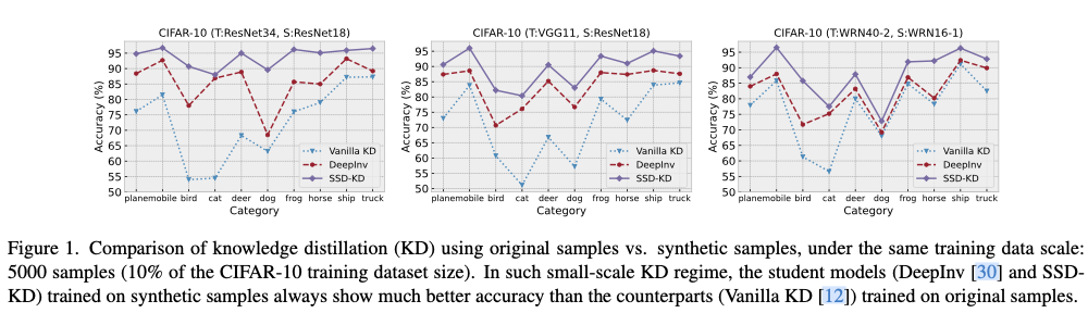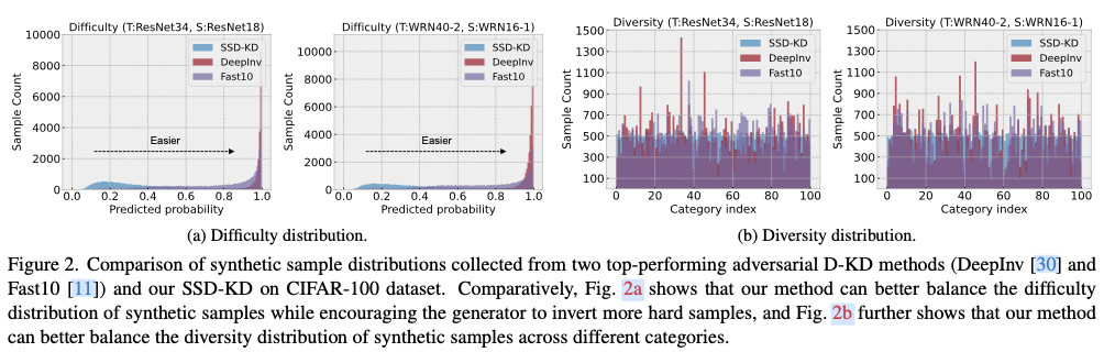 然而,论文其他两个观察表明,现有的D-KD方法,包括传统的和最有效的设计,都没有在小数据规模下平衡上述两个方面的类别分布的良好能力,如图2所示。需要注意的是,已经存在一些D-KD方法来增强合成样本的多样性,但合成样本在样本难度方面的多样性尚未被探讨。
