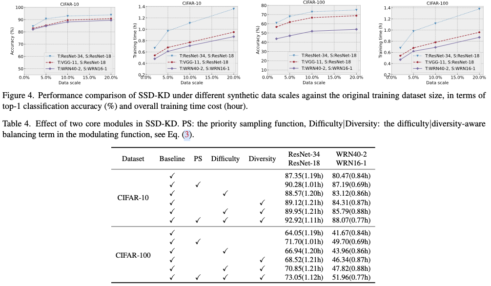 基于上述观察和分析,论文提出了SSD-KD,引入了两个相互依赖的模块以显著提高主要的对抗性反演和蒸馏范式的整体训练效率。SSD-KD的第一个模块依赖于一种新颖的调制函数,该函数定义了一个多样性感知项和一个难度感知项,以明确的方式共同平衡合成样本在数据合成和知识蒸馏过程中的类别分布。第二个模块定义了一种新颖的优先采样函数,这一函数通过强化学习策略来实现,从候选样本中选择少量适当的合成样本,这些样本存储在一个动态重放缓冲区中用于知识蒸馏,从而进一步提高端到端的训练效率。得益于这两个模块,SSD-KD具有两个吸引人的优点。一方面,SSD-KD可以在极小规模的合成样本(比原始训练数据规模小10倍)上进行蒸馏训练,使得整体训练效率比许多主流的D-KD方法快一个或两个数量级,同时保持竞争力的模型性能。另一方面,SSD-KD在学生模型准确性方面获得了大幅度的提升,并且在将合成样本的数据规模放宽到相对较大的数量时(仍然小于现有D-KD方法的规模)保持了整体训练效率。