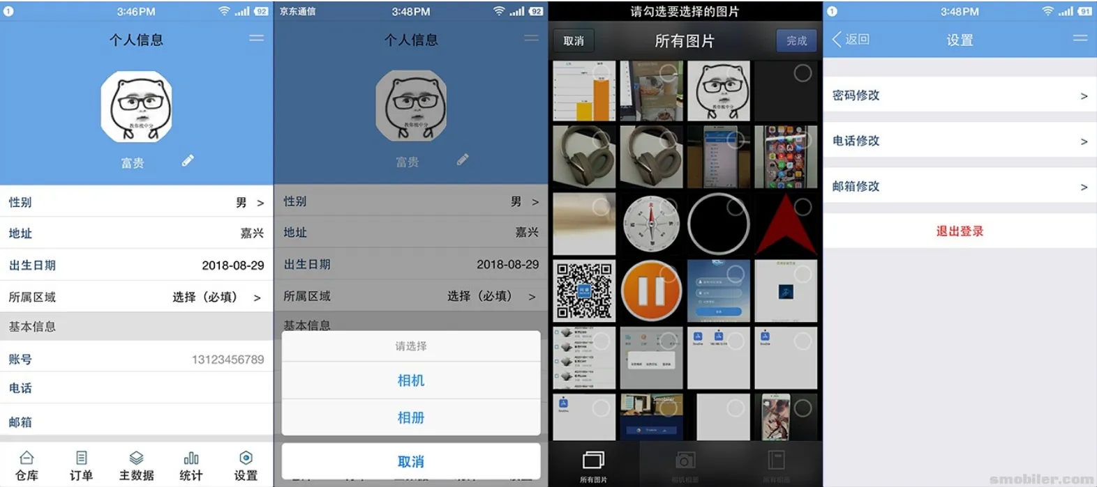 在设置部分,可以修改个人信息,包括拍照或从相册上传个人头像,以及修改密码、邮箱和电话等。