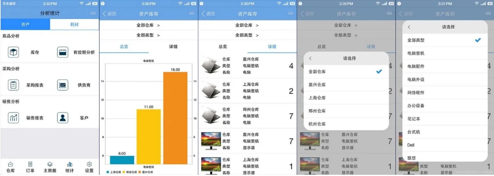 统计功能提供资产和耗材的商品分析、采购分析和销售分析。