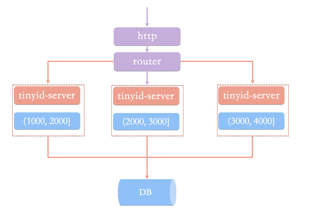 ID生成系统向外提供http服务,请求经过负载均衡router,能够路由到其中一台tinyid-server,这样就能从事先加载好的号段中获取一个ID了。