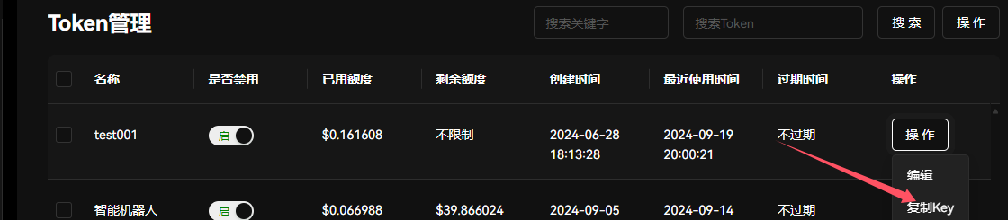 安装完成以后打开我们的AI平台http://api.token-ai.cn/注册一个账号,然后登录到控制台,打开AI服务/令牌,然后点击复制Key