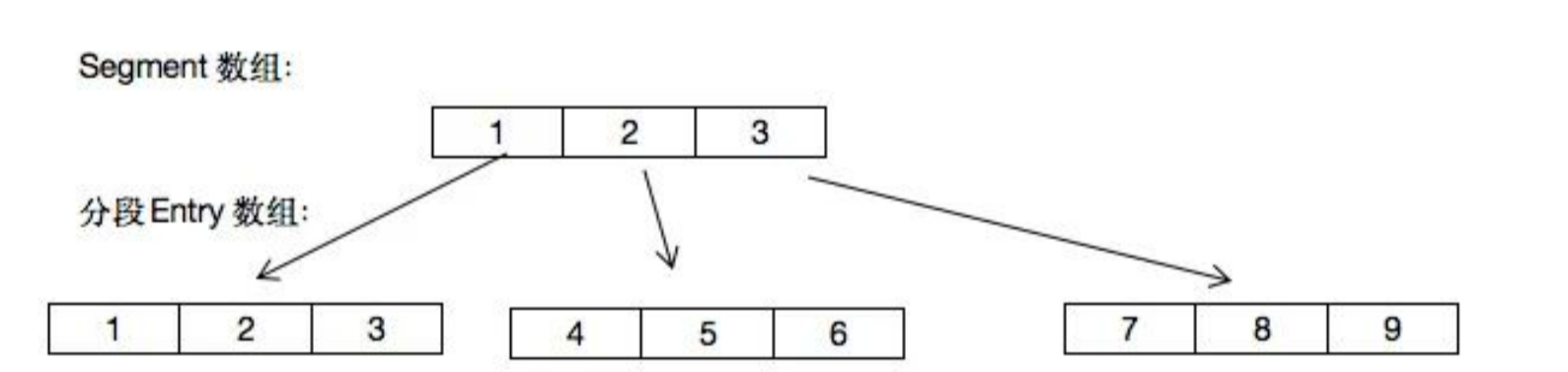 段Segment继承了重入锁ReentrantLock,有了锁的功能,每个锁控制的是一段,如下图所示: