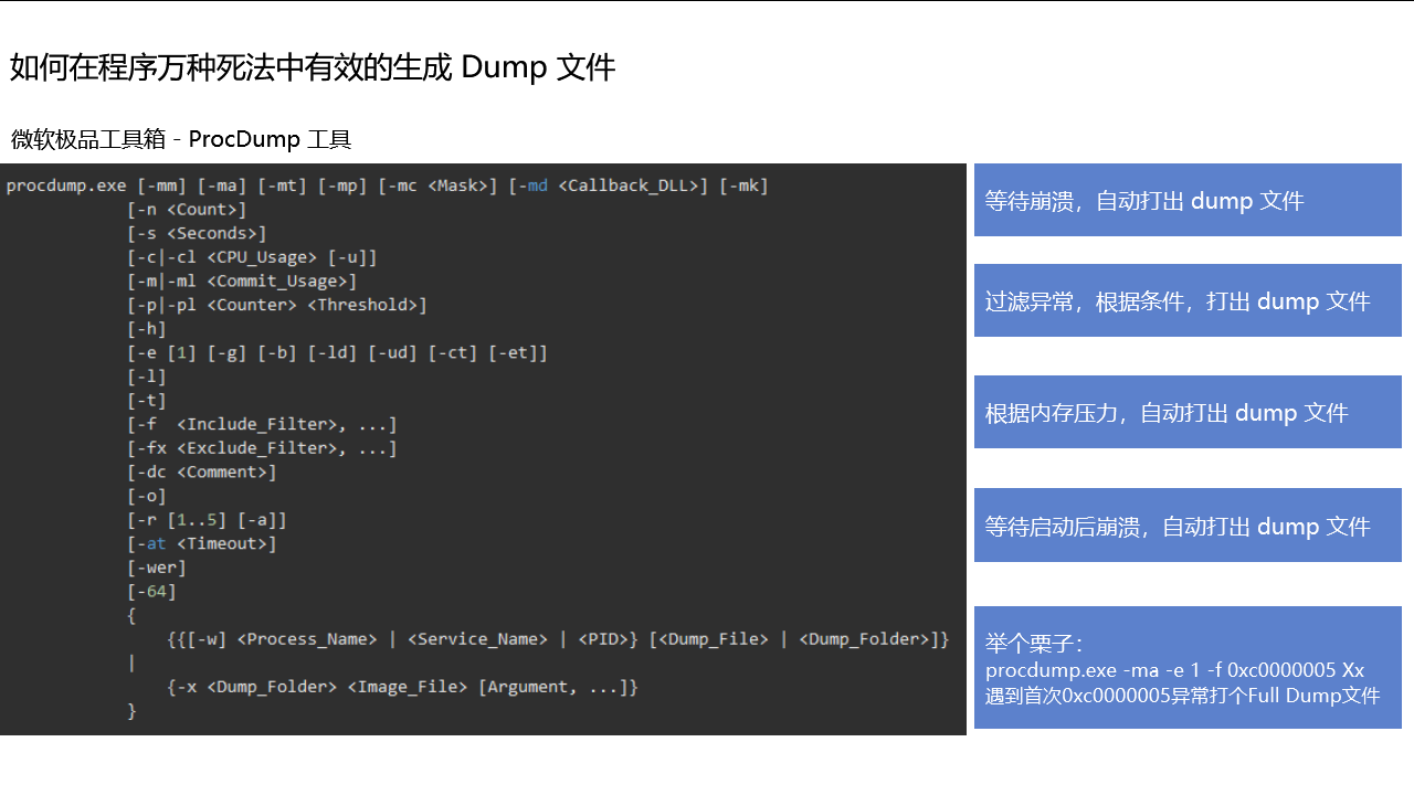 通过 ProcDump 可以在程序万种死法中有效的生成 Dump 文件,只需使用好 ProcDump 的参数。具体参数作用可以参考 微软官方文档 和 如何在 NET 程序万种死法中有效的生成 Dump (上) - 一线码农 - 博客园