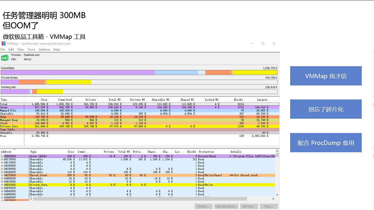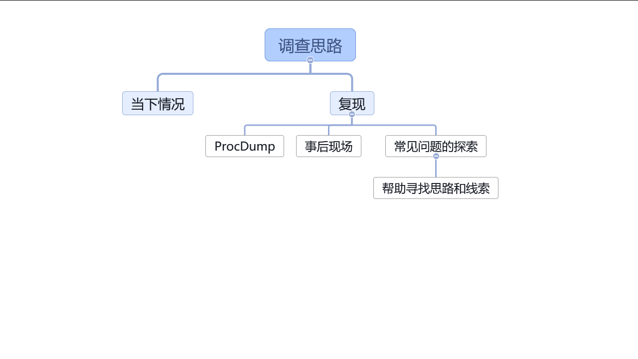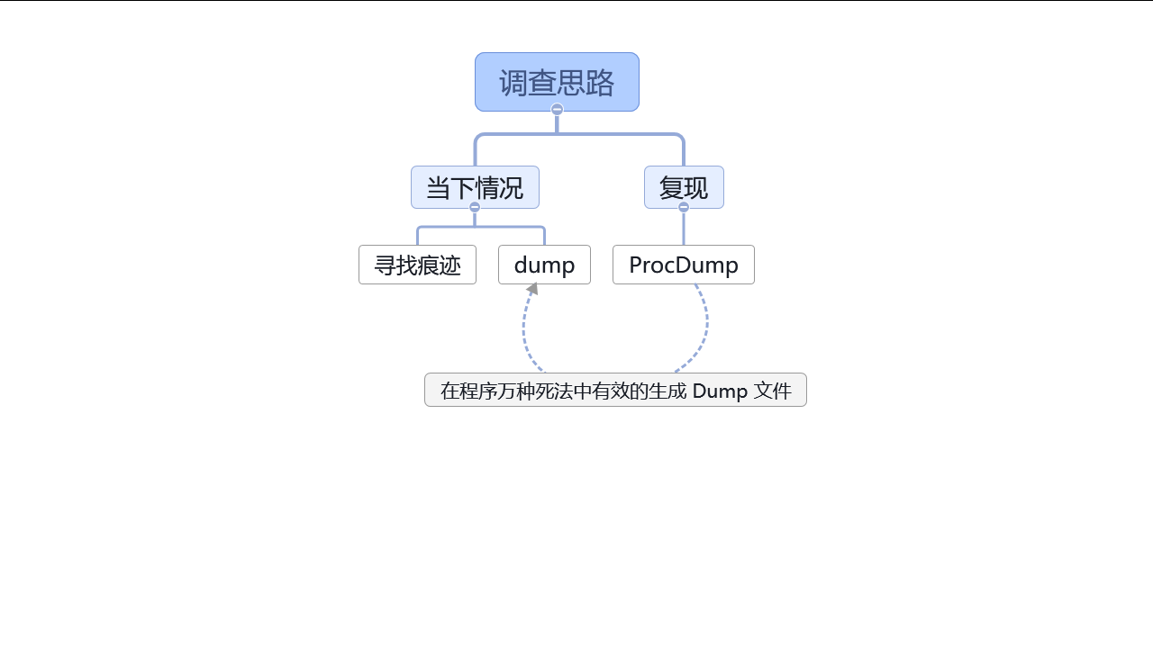 在调查思路这里,复现问题时经常伴随使用 ProcDump 工具,因为 ProcDump 工具可以在非常多的情况下帮助我们捞 DUMP 文件