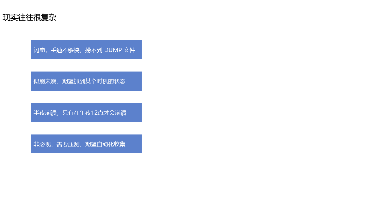 为什么说有时候不好使用任务管理器捞 DUMP 呢?因为现实往往很复杂。除了闪崩,软件启动即崩溃导致的手速不够快,捞不到 DUMP 文件之外,还有其他很多问题。比如软件就是处于似崩未崩的状态,期望抓到某个时机的状态,如软件一定会在某次 CPU 爆高之后不能符合预期工作,然而 CPU 爆高的时间非常短,靠人类去看去抓是有些废程序猿的。比如软件半夜崩溃,只有在午夜12点才会崩溃,这时候人类可能已经睡着了,即使没睡着,可能错过了这个时间点就要等明天的午夜12点了。再比如是非必现的问题,需要压测才能复现,期望自动化收集,否则可能要跑几千次才能复现一次,靠人类的工作量有些大
