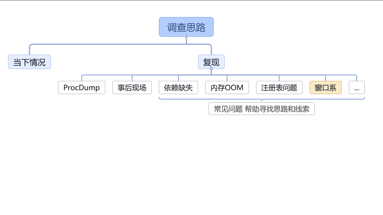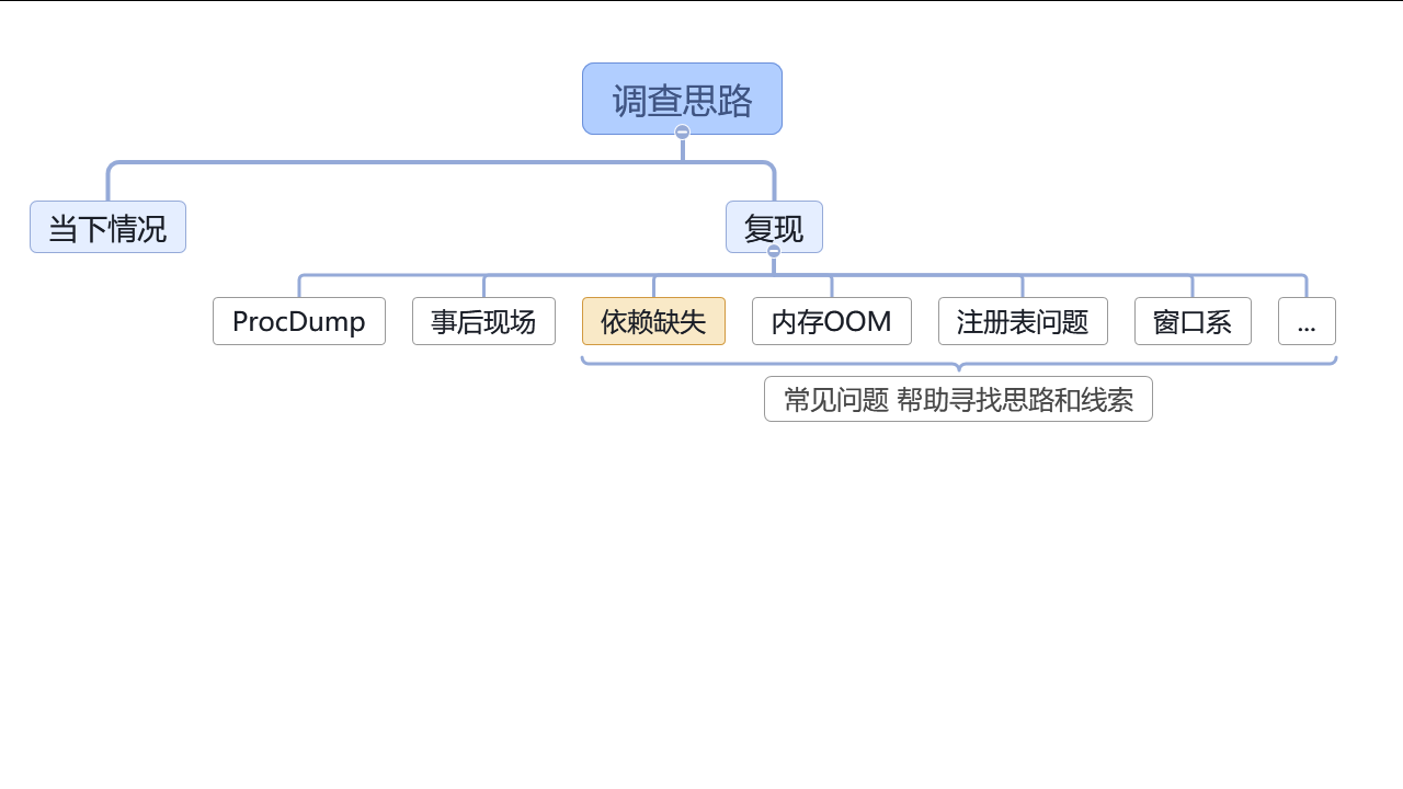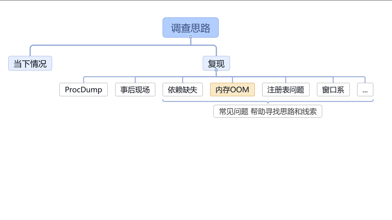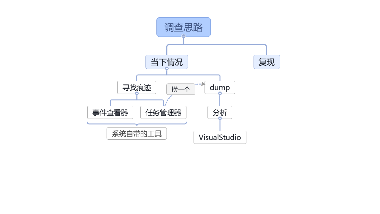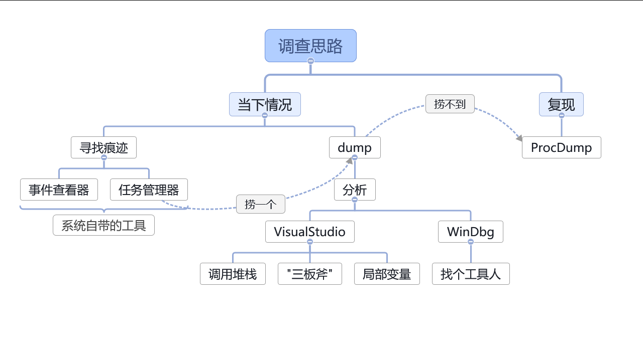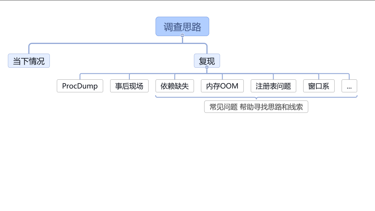复现问题时,不仅只有 ProcDump 工具。还有可能面对的是事后现场的情况,此时需要使用更多的工具来辅助定位问题。以及当没有调查思路时,可以试试常见的问题的探索帮助寻找思路