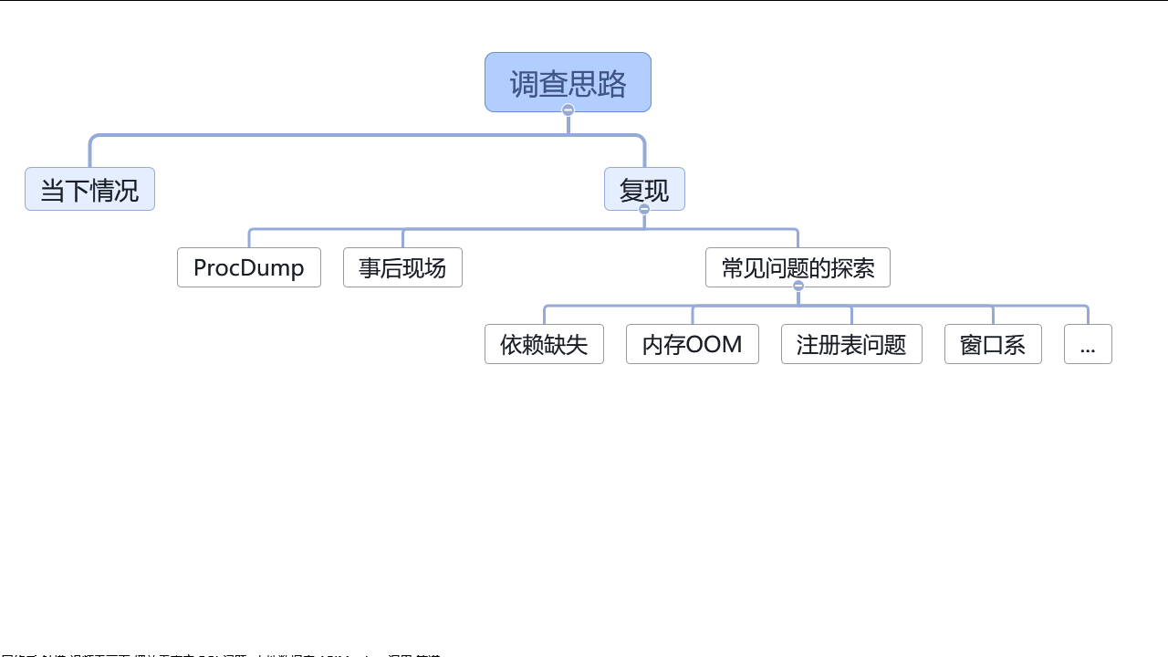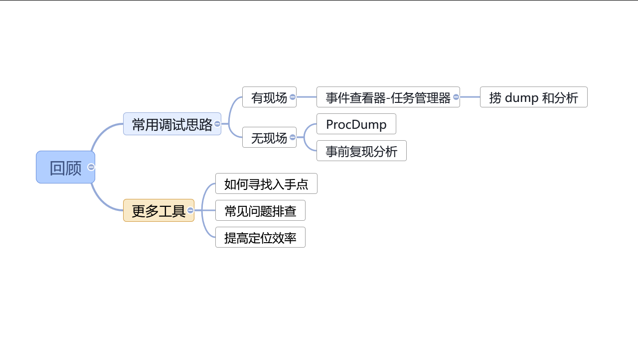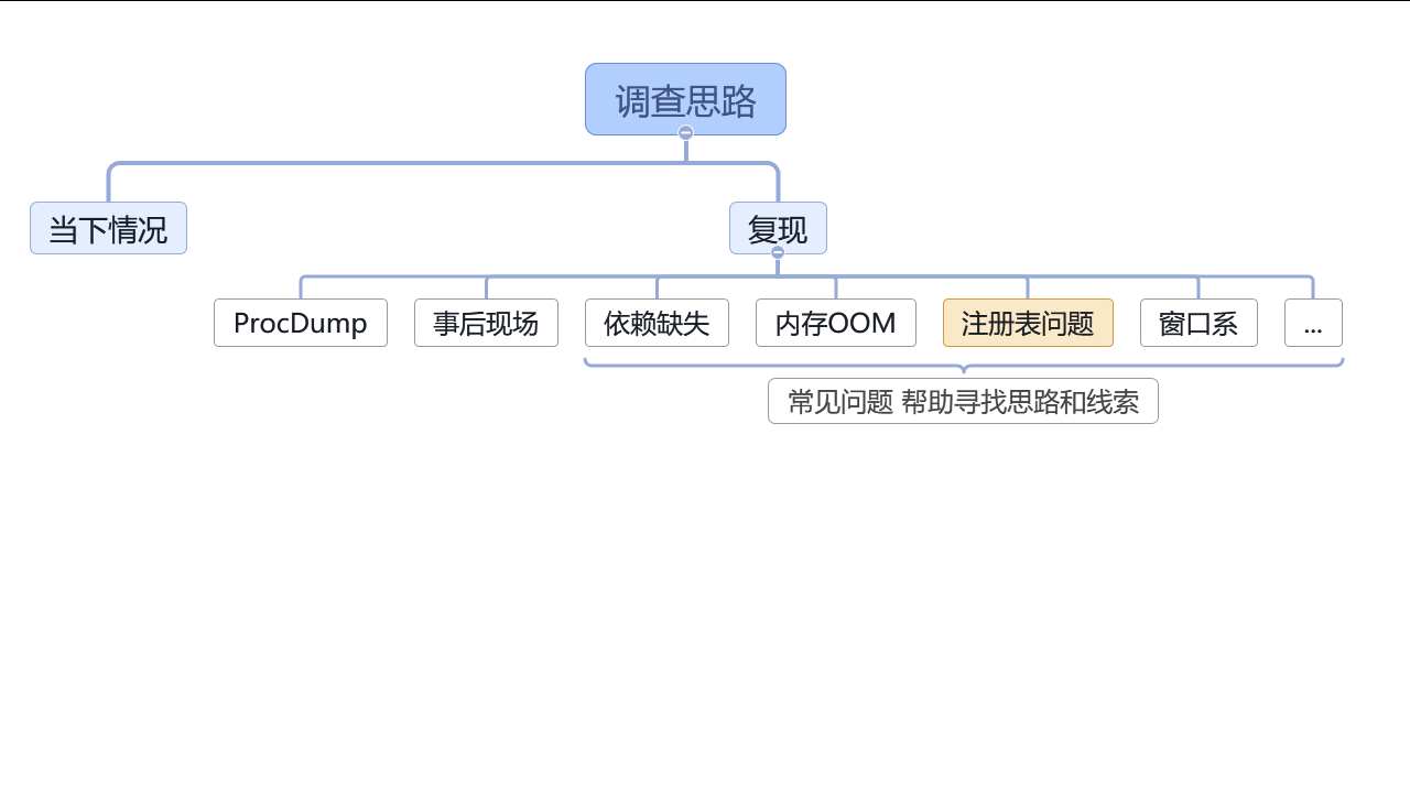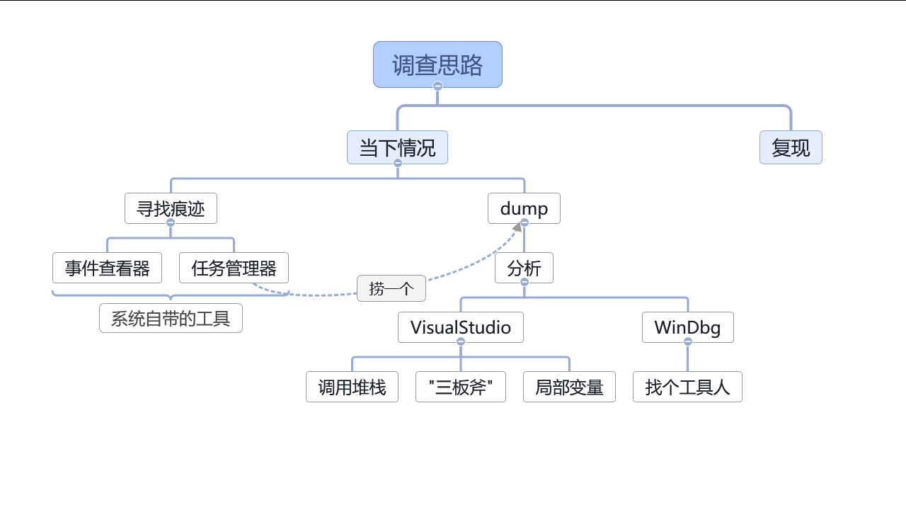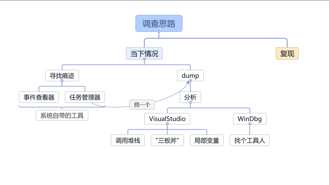 复现问题时,不仅只有 ProcDump 工具。还有可能面对的是事后现场的情况,此时需要使用更多的工具来辅助定位问题。以及当没有调查思路时,可以试试常见的问题的探索帮助寻找思路