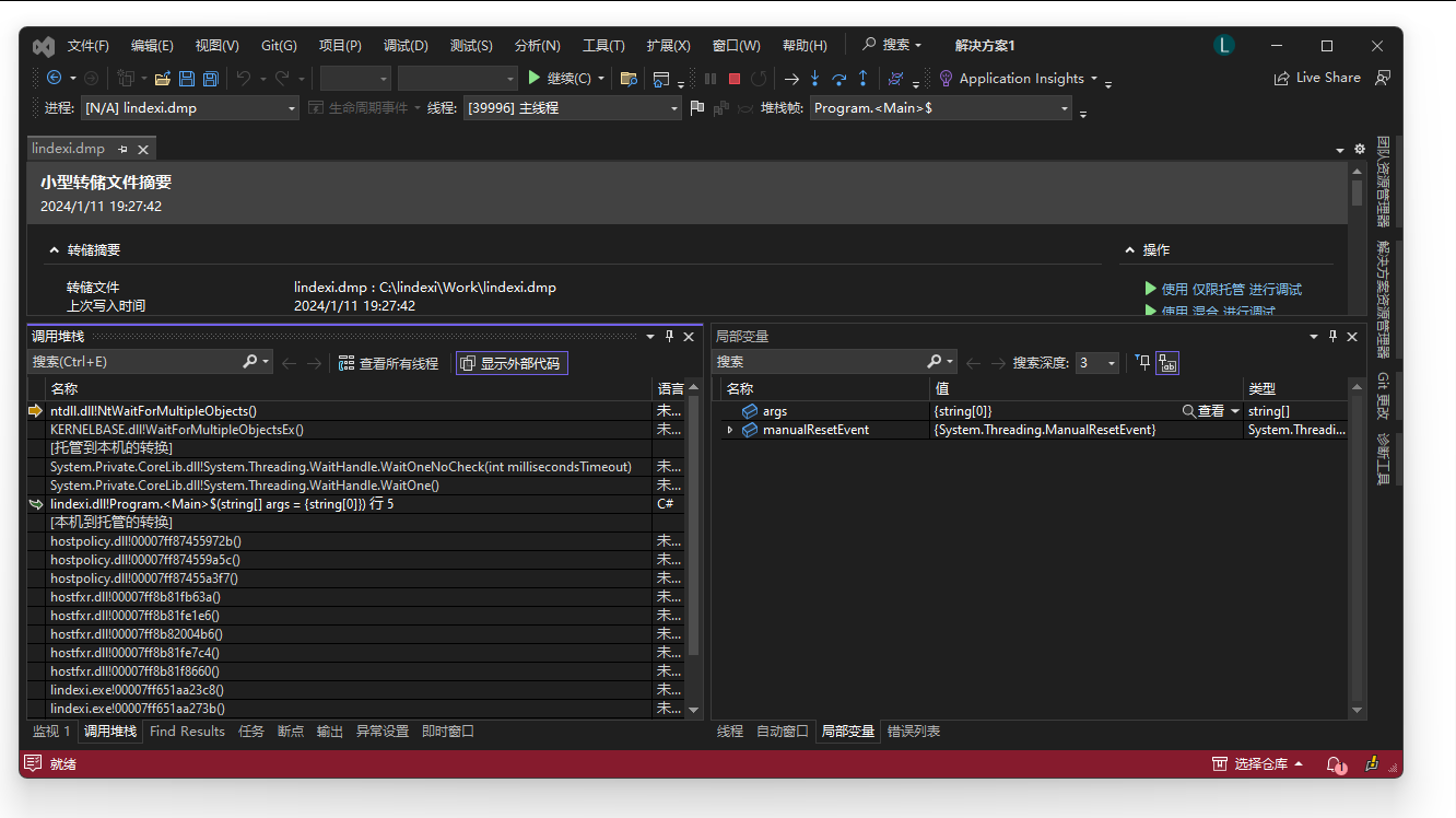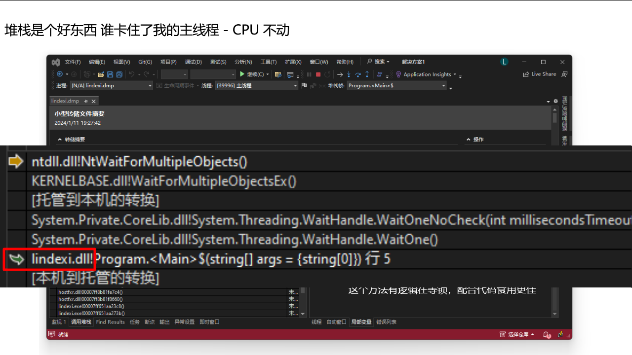 通过以上的堆栈可以知道进入了锁。此时的常见套路就是从上到下找找,找第一个咱自己程序集的调用函数,如这里就找到了是在 lindexi.dll 里面的方法。可以知道的是这个方法有逻辑在等待锁,且这个锁就不返回。此时配合代码食用更佳。咱这里能够知道进程卡住的原因是因为等待锁,且这个锁不返回,而至于这个锁在业务上是什么作用就需要咱进一步配合代码进行分析了