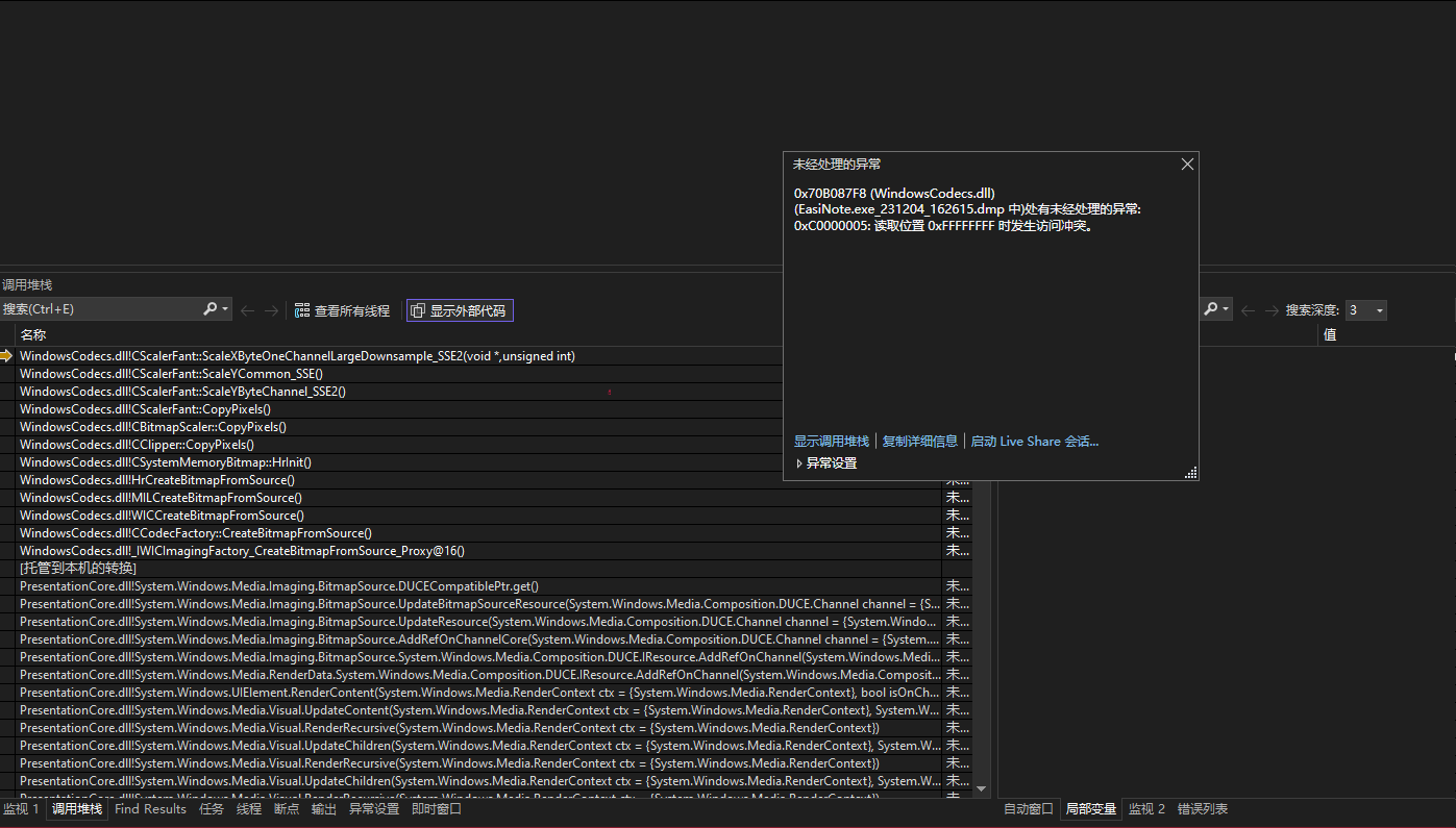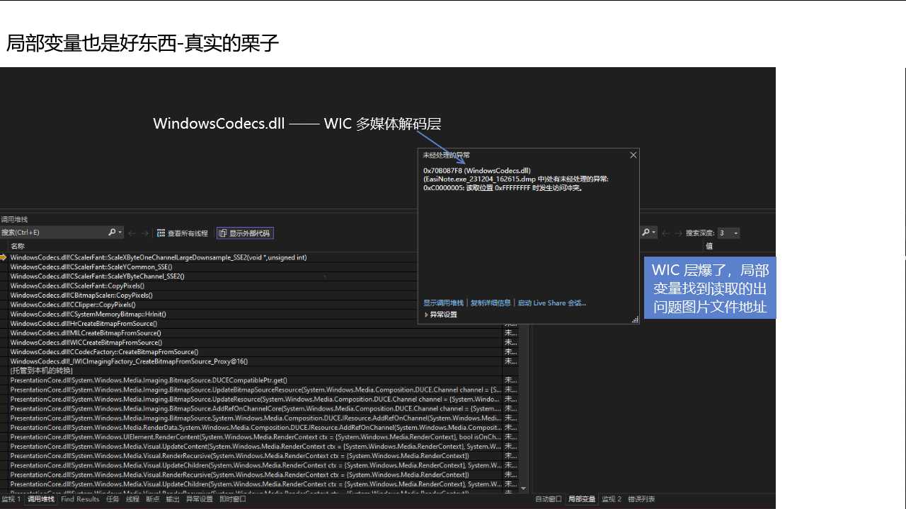 再举另一个真实的例子,如看到的是如上图的异常导致的崩溃。根据咱通过搜索引擎了解到的知识,这个 WindowsCodecs.dll 是 Windows 系统的 WIC 多媒体解码层。可能此时遇到的问题和图片等多媒体的编解码有关