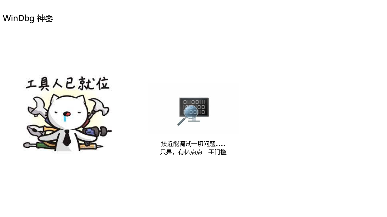 在这里我告诉大家一个非常简单的方法,让大家瞬间就能学会上手使用 WinDbg 工具调试问题。方法就是请一个熟悉 WinDbg 的伙伴,让他帮你调试,找到一个工具人帮你使用 WinDbg 调试问题是最快能学会使用 WinDbg 的方法