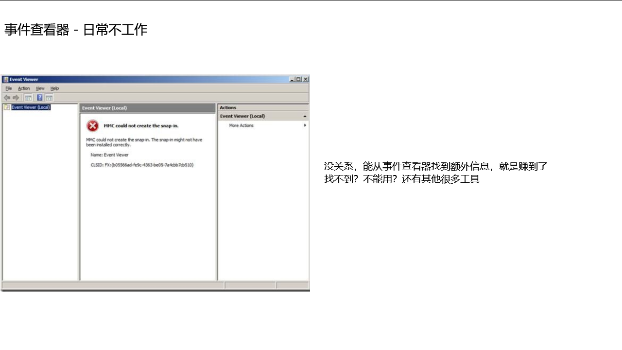 可惜的是在很多用户的设备上,事件查看器日常不工作。没关系,能从事件查看器找到额外信息,就是赚到了