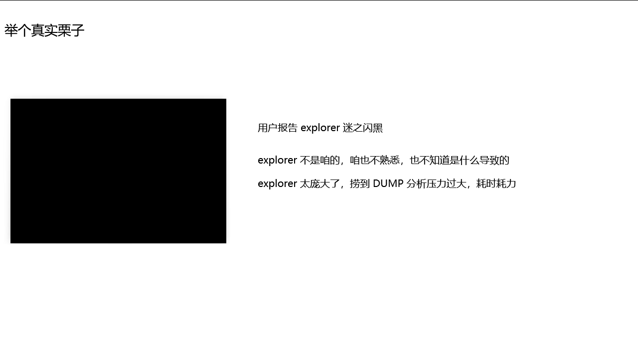 这个问题的开始是测试同学和我报告了触摸失效问题,后来经过进一步调查发现其实是 explorer 未响应问题,表现就是 explorer 迷之闪黑
