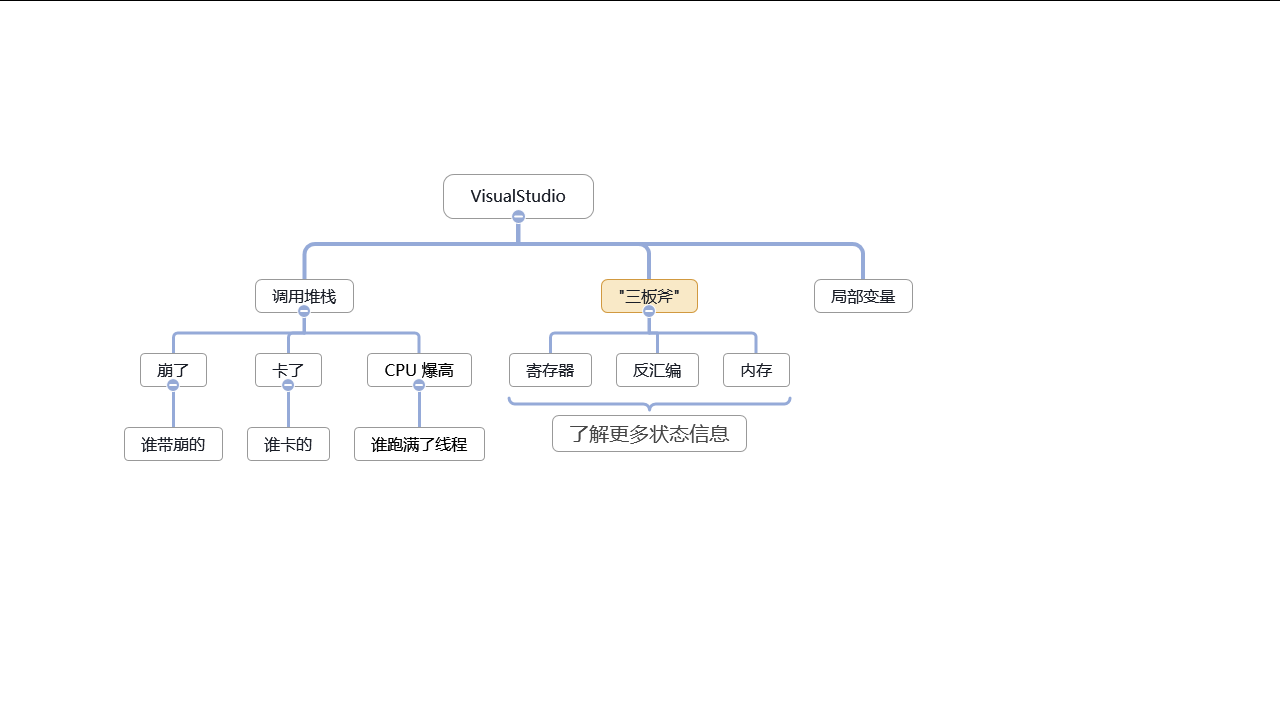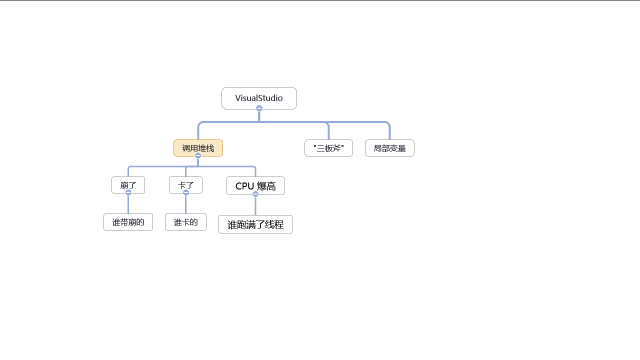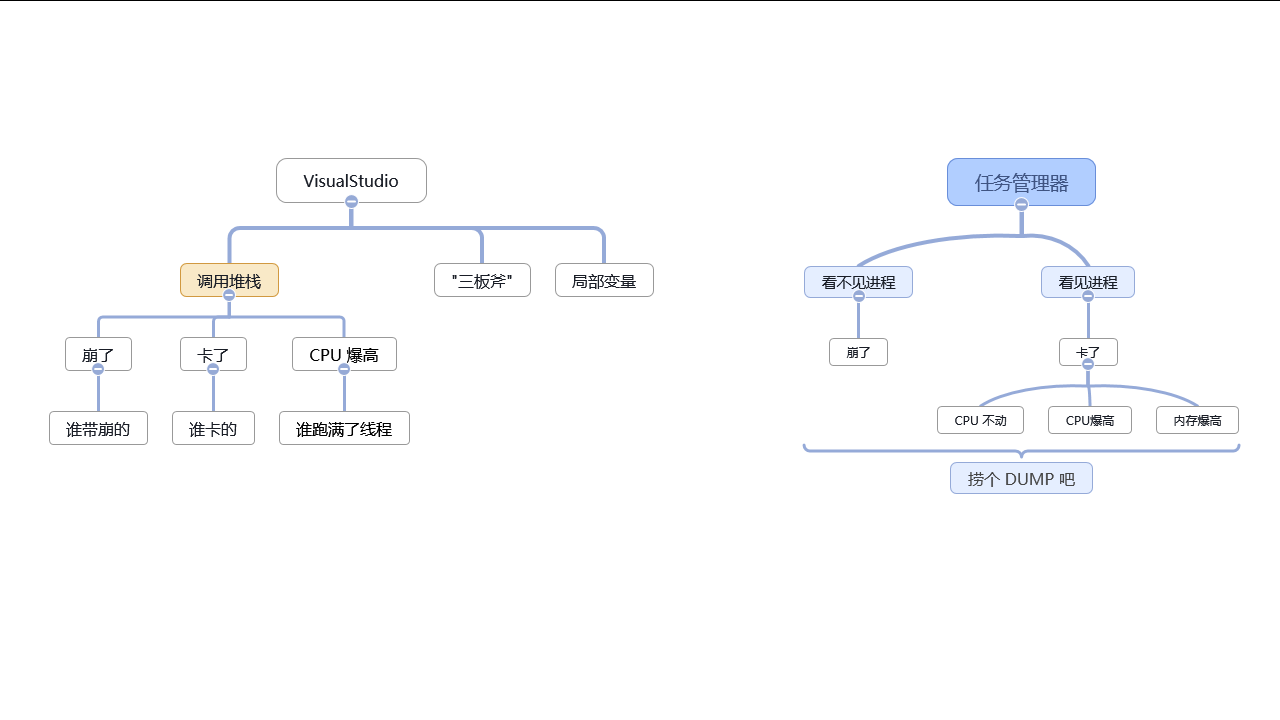 调用堆栈可以如何看?调用堆栈可以和着之前在用户端任务管理器所见内容进行一起分析。如在任务管理器看不见进程,即对应进程崩了的问题,可以通过调用堆栈尝试看到是谁带崩的,崩之前调用的是哪个函数。如果是在任务管理器能看到进程,但是 CPU 使用率不动,那可能是死锁问题,可以通过调用堆栈看到是哪个函数卡住了主线程或进入锁。如果是 CPU 使用率爆高,那可能是死循环问题,可以通过调用堆栈看到是哪个函数跑满了线程