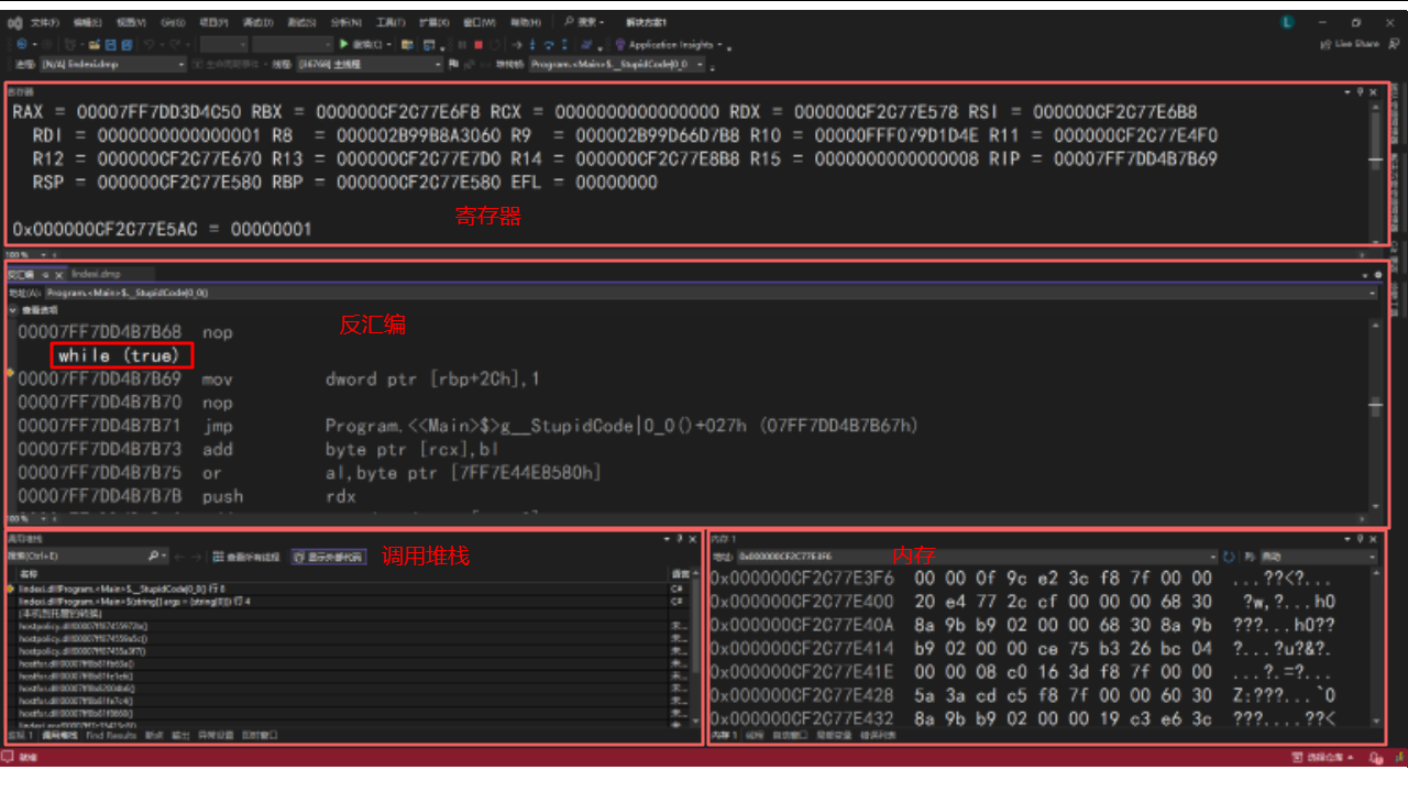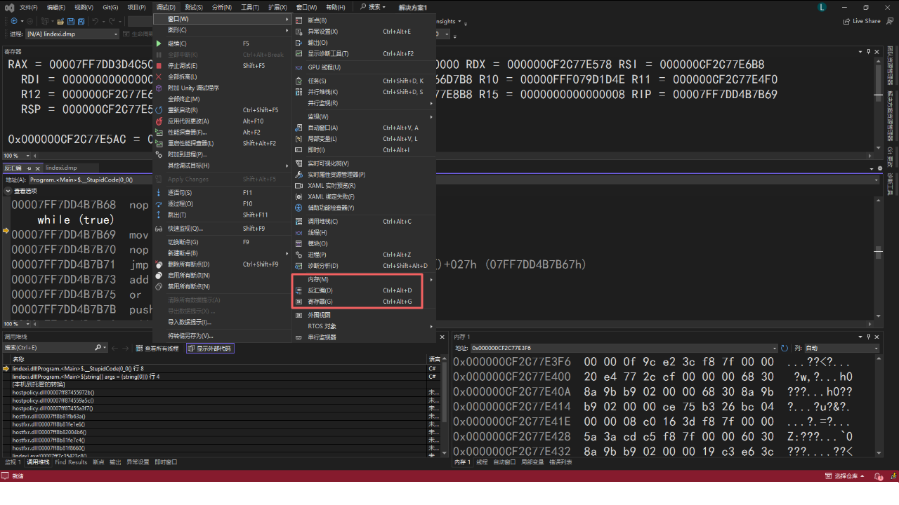 试试先在 Visual Studio 里面打开内存、寄存器、反汇编窗格。这三个工具可以帮助我们进一步分析问题