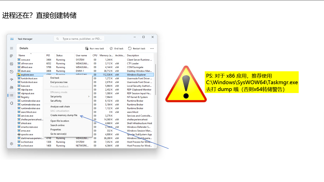 这里需要额外说明的是,如果当前系统是 x64 系统,但是自己的进程是 x86 进程,那此时不建议使用默认打开的任务管理器捞 DUMP 文件。因为默认打开的任务管理器是 x64 的,打出来的是 x64 转储文件,包含 WoW64 子系统的信息。详细请看 你生成的转储文件有问题吗? - 知乎