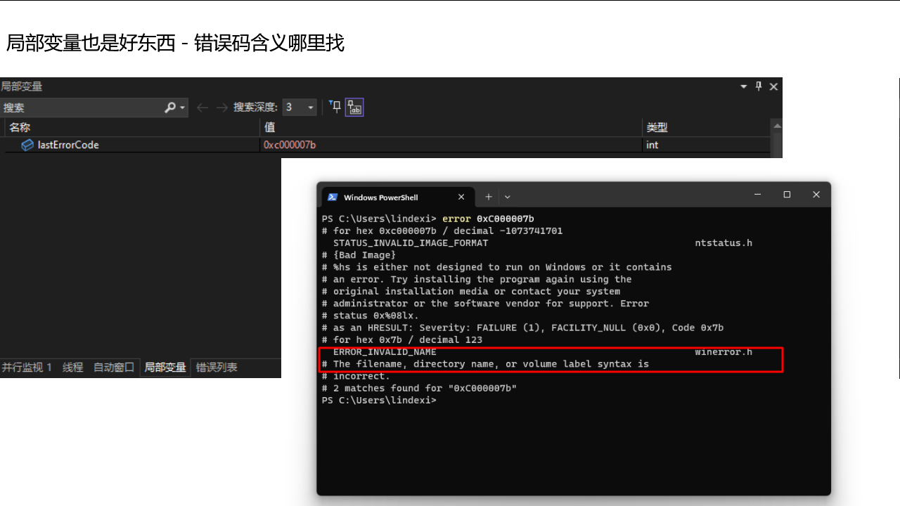 如看到了错误之前的局部变量有一个名为 lastErrorCode 的变量,也许可以通过这个变量的值来了解到错误的原因。但是这个错误码是什么意思呢?这个错误码的含义在哪里找呢?咱可以试试 error 这个工具,这个工具可以自动帮助咱找到可能的错误码的含义。这是工具是微软整理的,绝大部分调用系统层的组件所见的错误码都可以在这里找到