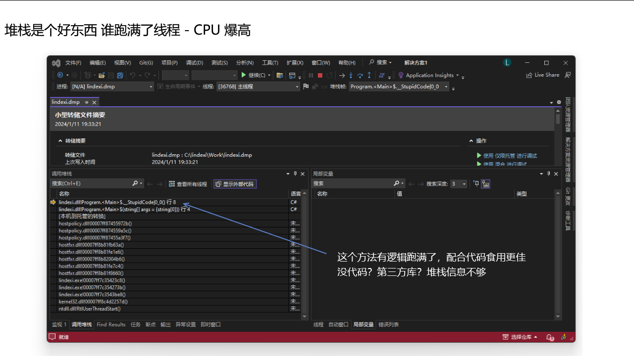 回顾一下,这就是咱拖入 DUMP 文件之后,依靠 Visual Studio 里面的调用堆栈进行问题分析的常见三个案例。对应软件崩溃的问题,可以通过调用堆栈看到是谁带崩的。对应 CPU 不动的问题,可以通过调用堆栈看到是谁卡住了主线程。对应 CPU 爆高的问题,可以通过调用堆栈看到是谁跑满了线程