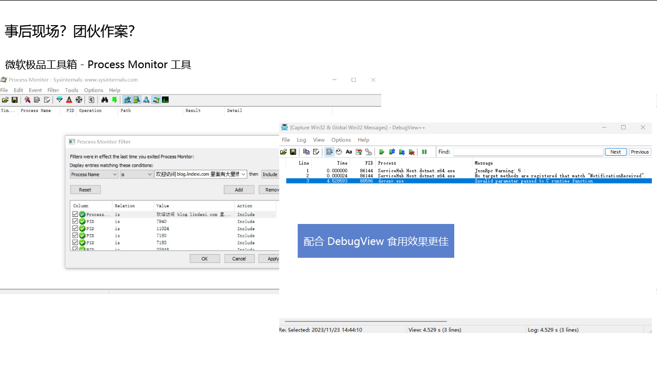 面对事后现场和团伙作案等问题,采用微软极品工具箱的 Process Monitor 工具,配合 DebugView 工具通常都能有不错的收获