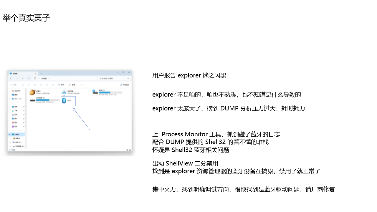 这个问题复杂之处在于 explorer 不是咱的,咱也不熟悉,也不知道是什么导致的。而且 explorer 太庞大了,捞到 DUMP 分析压力过大,耗时耗力。需要使用更多的工具辅助进一步分析问题