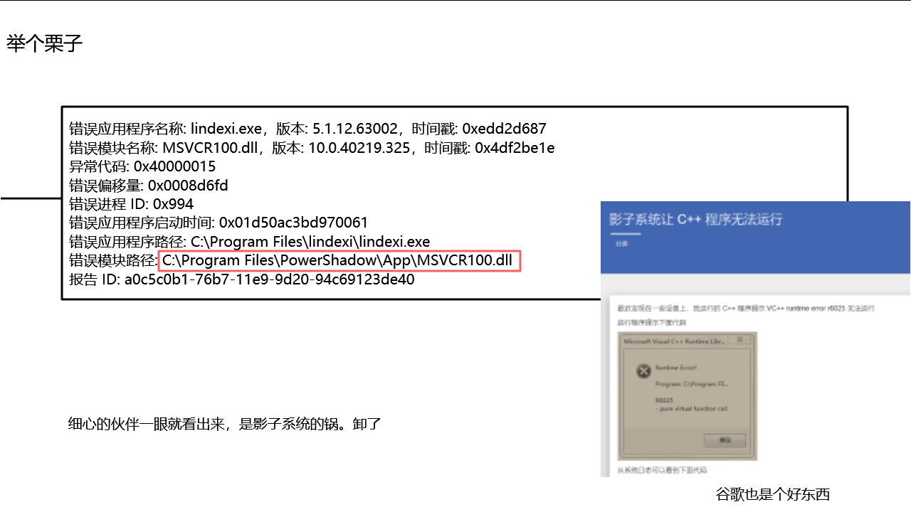 细心的伙伴也许一眼就看出来问题了,出现问题的是 MSVCR100.dll 模块,然而这个模块路径居然是在一个不认识的,名为 PowerShadow 的软件的目录下。这时候就可以大概确定问题了,这是被投毒了