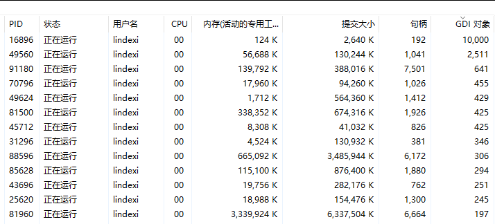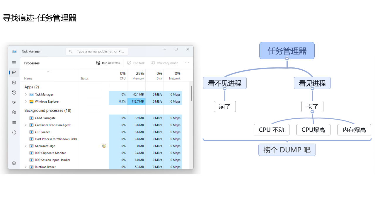 通过任务管理器寻找痕迹时,可以按照如上图所示的决策树了解一下情况。如果不能在任务管理器里面看到进程,那很可能就是进程已经崩掉了。如果能够看到进程,那可能就是进程卡了。此时关注点可以是 CPU 使用率。如果 CPU 使用率不动,那可以猜猜可能是死锁问题,如果 CPU 使用率爆高,那可能是死循环等问题。同步也看一下内存使用率,虽然在任务管理器里面看内存使用率不能真实反映内存使用情况,但是可以作为一个参考。详细关于如何正确查看程序的内存使用情况,后面会有专门的内容介绍