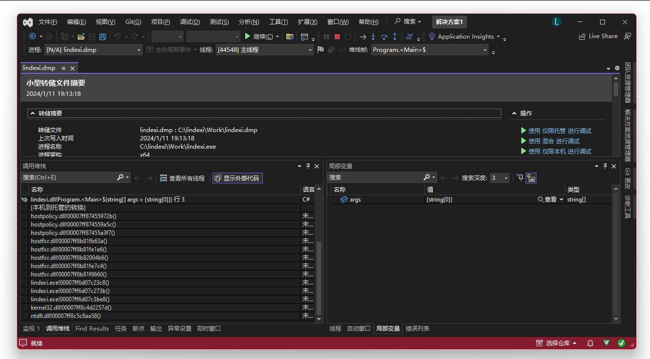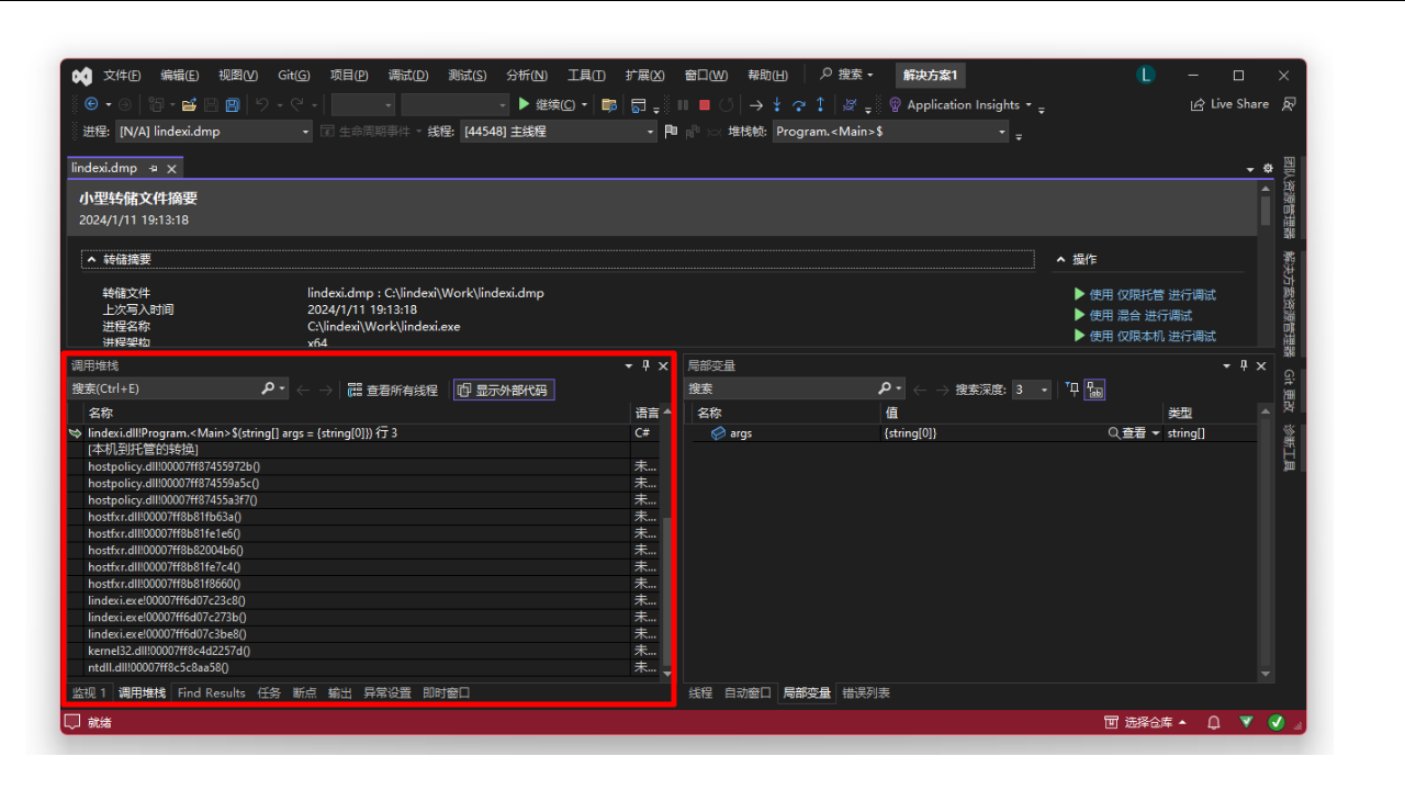 回顾一下,以上咱就聊了在用户端发现问题,先尝试使用 Windows 自带工具快速进行定位问题。以及捞到 DUMP 文件之后,如何在开发机器上通过 Visual Studio 进行进一步分析。分析的方法就是将 DUMP 文件拖入 Visual Studio 里面,然后点击混合调试按钮。等待 Visual Studio 自动分析,即可看到分析结果。分析的重点是调用堆栈、三板斧、局部变量。通过这三个方面的工具可以帮助我们进一步的分析问题