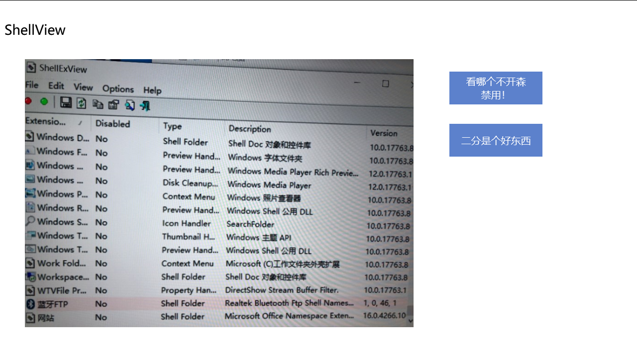 既然大概定位到这里,那就继续上 ShellView 工具。通过 ShellView 工具进行大量的 Shell32 组件的禁用,我的做法大概就是看哪个不开森就禁用哪个,进行二分法的禁用,最终发现了是 Realtek Bluetooth 蓝牙模块导致的问题