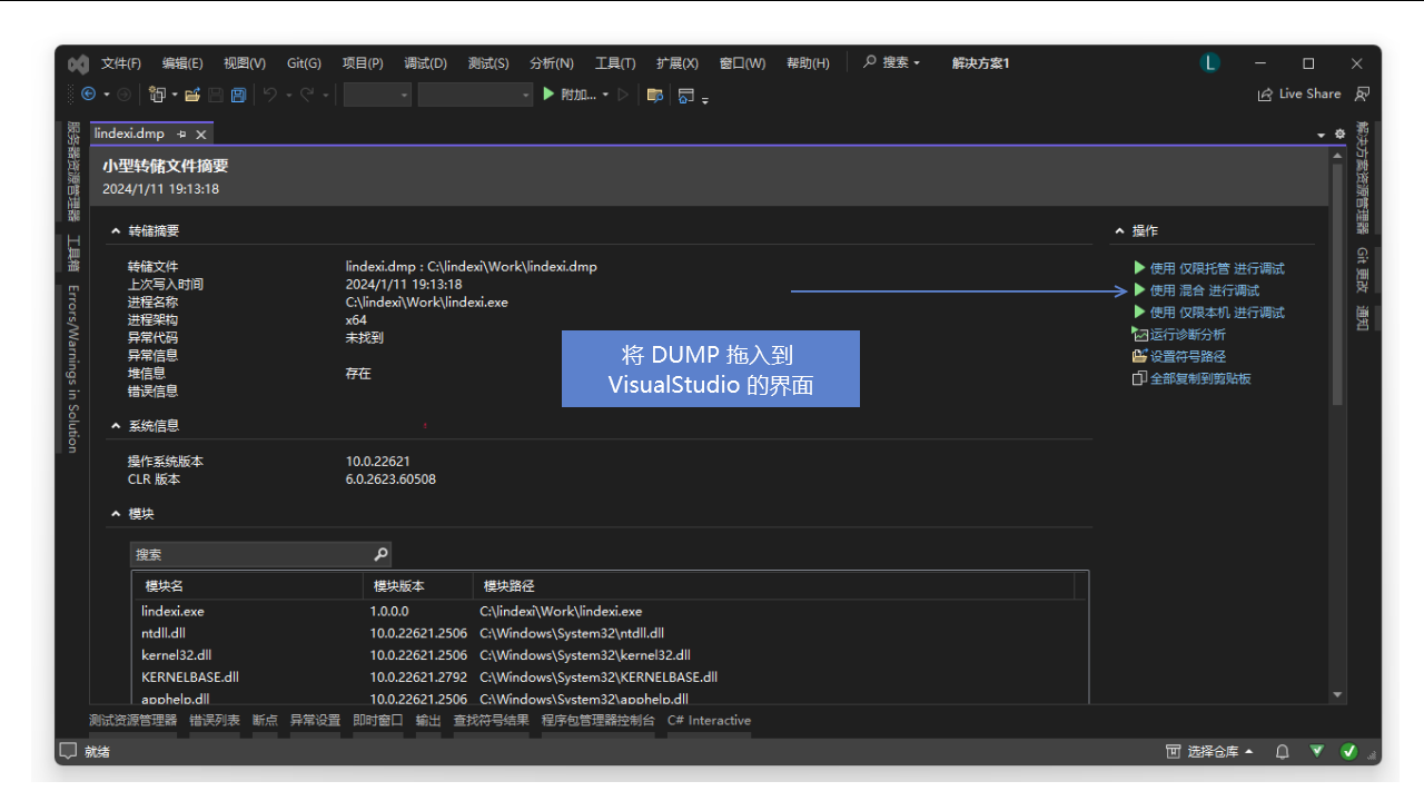 好的,现在咱的进度就是在用户侧发现了问题,且不能通过事件查看器等结束战斗。将用户的 DUMP 文件捞回来,通过 Visual Studio 进行分析。分析的方法就是将 DUMP 文件拖入 Visual Studio 里面,然后点击混合调试按钮。等待 Visual Studio 自动分析,即可看到分析结果