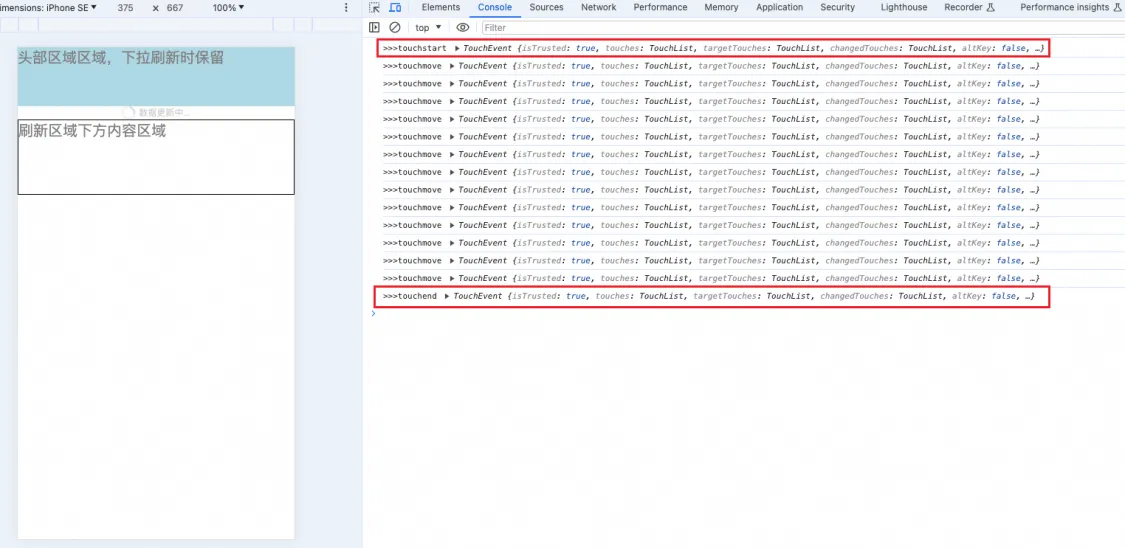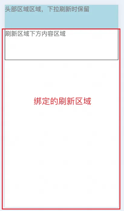 首先需要给需要设置下拉刷新的区域绑定上这些事件,对于我们业务场景来说,头部区域无论你如何操作,都需要保留展示的,那么我们只需要将事件绑定到下方开始显示下拉刷新的区域。