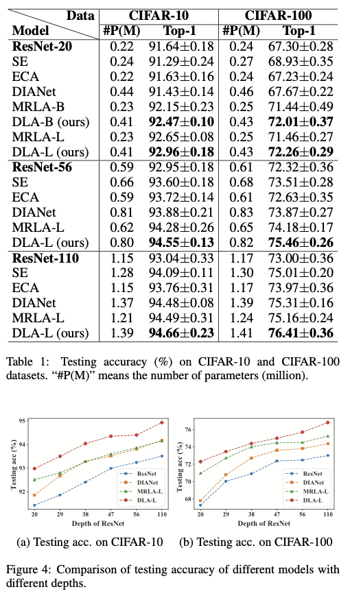 为了解决层级注意力的静态问题,论文提出了一种新颖的动态层级注意力(DLA)架构,以改善层间的信息流动,其中前置层的信息在特征交互过程中可以动态修改。如图2(b)所示,在重用前置层信息的过程中,当前特征的注意力从专注于某一特定层逐渐转变为融合来自不同层的信息。DLA促进了信息的更全面利用,提高了层间信息交互的效率。实验结果表明,所提的DLA架构在图像识别和目标检测任务中优于其他最先进的方法。