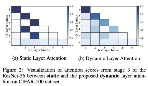 图2(a)可视化了在CIFAR-100上训练的ResNet-56的第3阶段的MRLA注意力分数。当前5层通过静态层级注意力重用来自前置层的信息时,只有一个特定层的关键值被激活,几乎没有其他层被分配注意力。这一观察验证了静态层级注意力削弱了层间信息交互的效率。