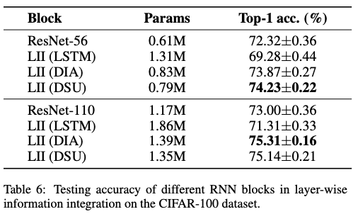 为了减少网络参数,令 \(\boldsymbol{W}_1\in \mathbb{R}^{\frac{C}{r}\times 2C}\) 和 \(\boldsymbol{W}_2\in \mathbb{R}^{C\times \frac{C}{r}}\) ,其中 \(r\) 是缩减比率。DSU将参数减少到 \(5C^2/r\) ,比LSTM的 \(8C^2\) 和DIA的 \(10C^2/r\) 更少。