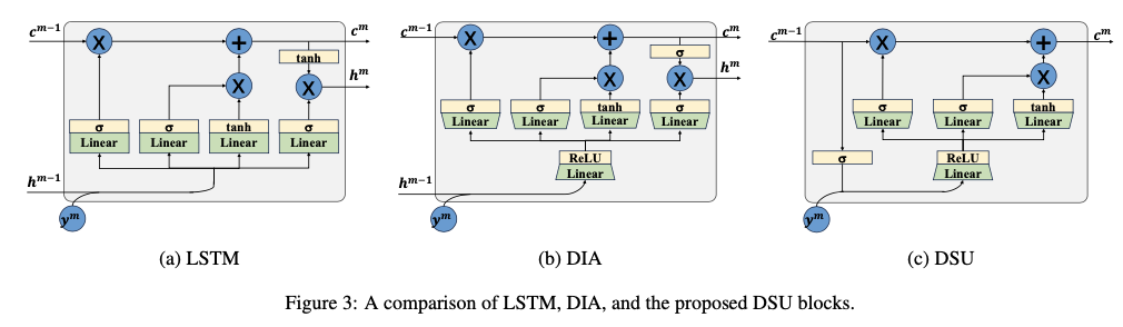 论文提出的简化RNN模块被称为动态共享单元(Dynamic Sharing Unit,DSU),工作流程如图3(c)所示。具体而言,在添加 \(\boldsymbol{c}^{m-1}\) 和 \(\boldsymbol{y}^m\) 之前,首先使用激活函数 \(\sigma(\cdot)\) 对 \(\boldsymbol{c}^{m-1}\) 进行归一化。在这里,选择Sigmoid函数 ( \(\sigma(z) = 1 /(1 + e^{-z})\) )。因此,DSU的输入被压缩如下:
