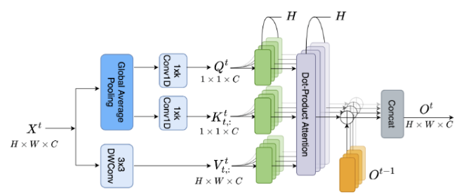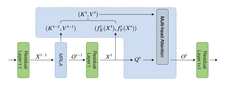 其中 \(\boldsymbol{\lambda}^{l}_o\) 是一个可学习的向量, \(\odot\) 表示逐元素相乘。通过多头结构设计,引入了多头递归层级注意力(MRLA)。