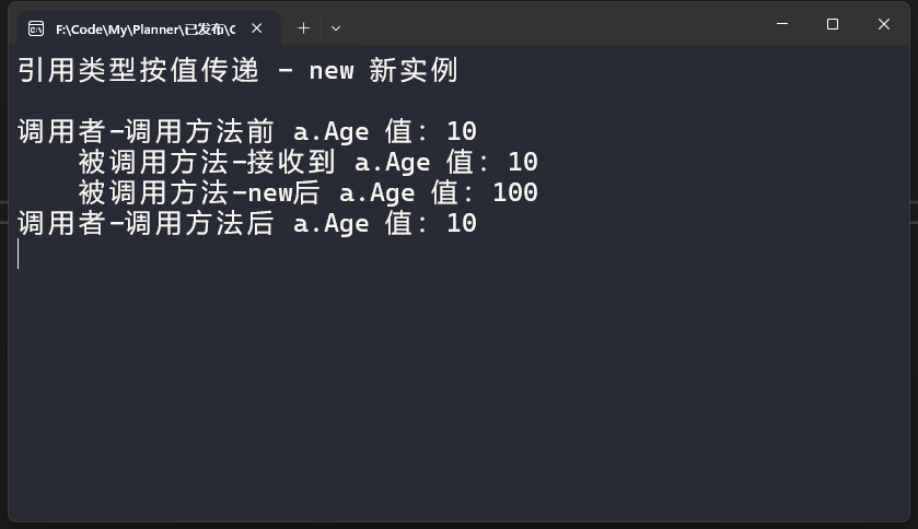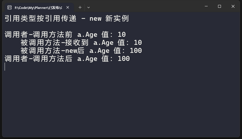 Console.WriteLine($" 被调用方法-new后 a.Age 值:{a.Age}");