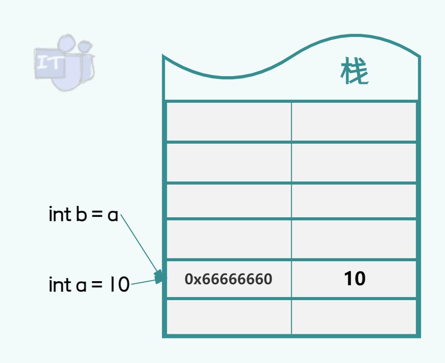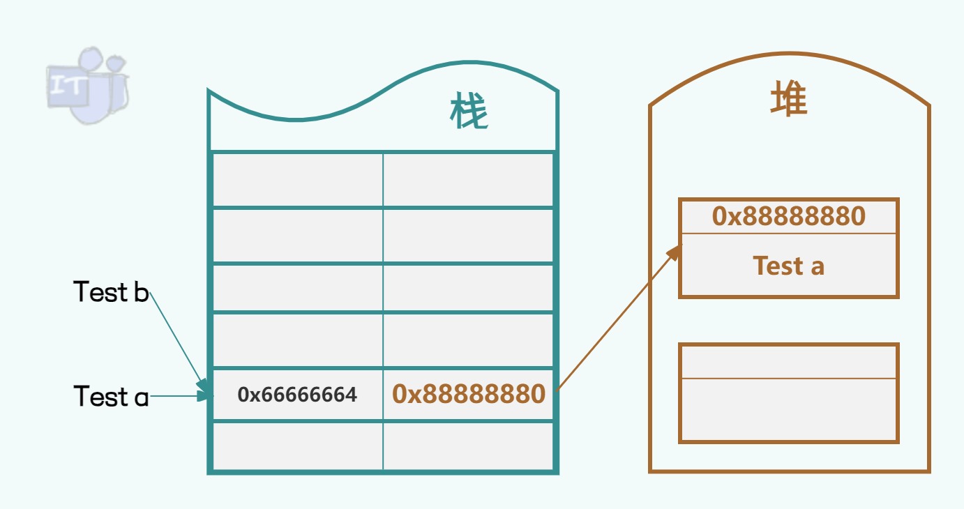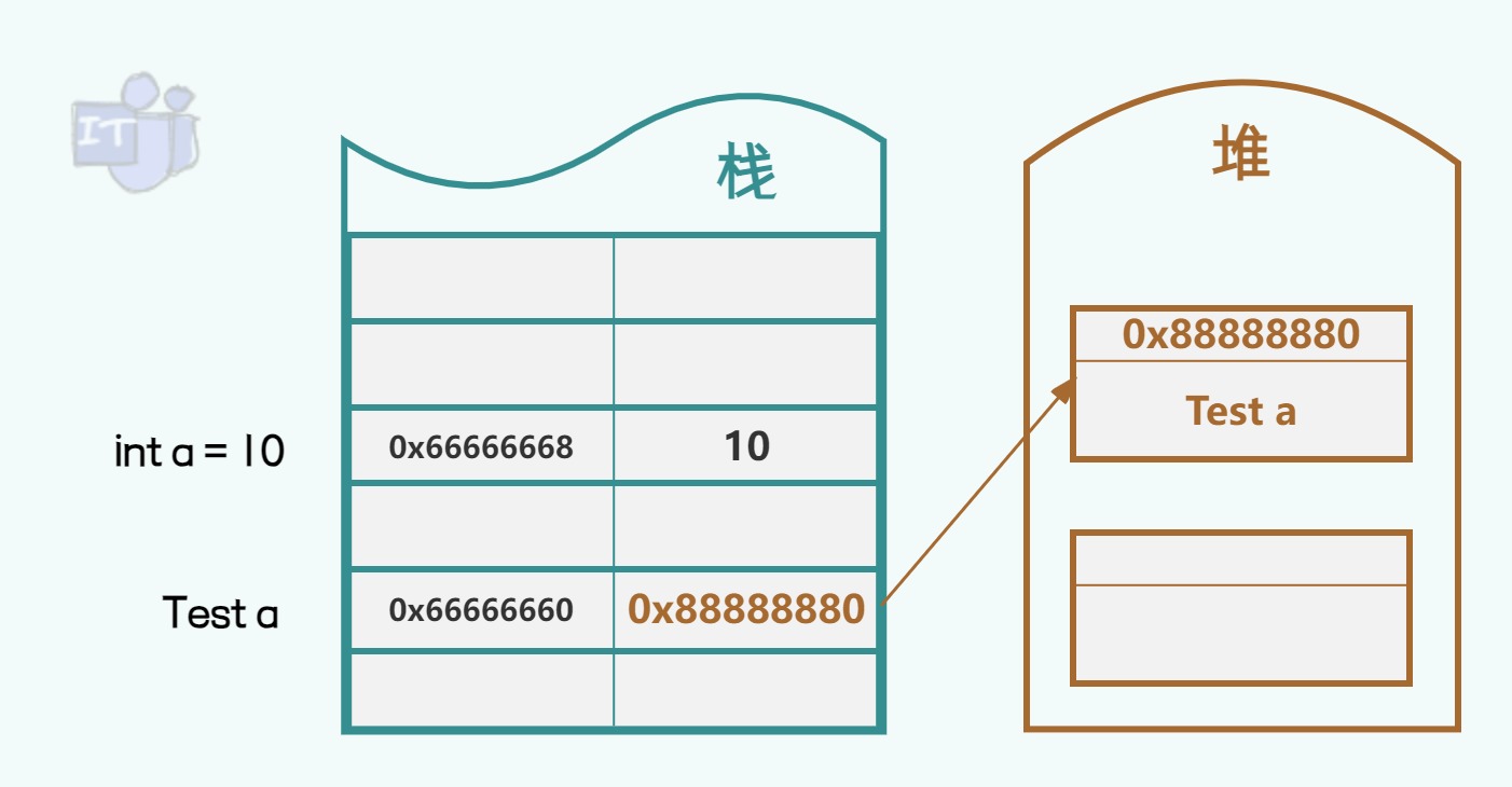 对于值类型变量的值直接存储在栈中,如下图的int a=10,10就直接存在栈空间中,而其栈空间对应的内存地址为0x66666668;对于引用类型变量本身存储的是实例对象的引用,即实例对象在堆中的实际内存地址,因此引用类型变量是存储其实例对象的引用于栈上,如下图中变量Test a在栈中实际存储的是实例对象Test a在堆中的内存地址0x88888880,而栈空间对应的内存地址为0x66666668。